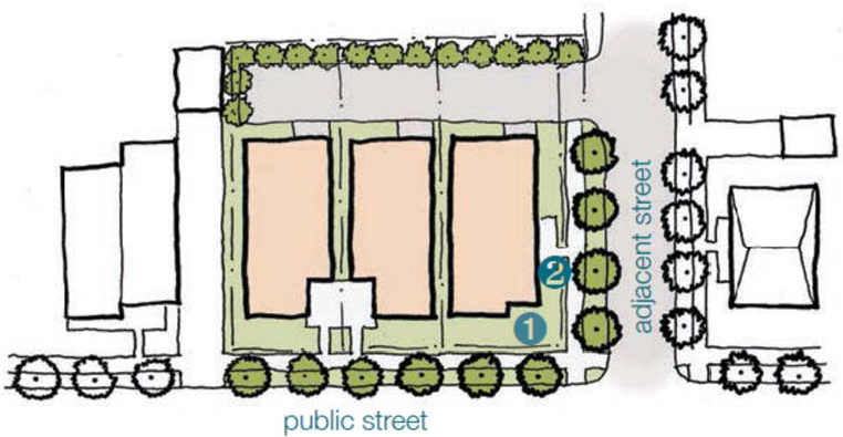 For homes not fronting a public street, a primary entrance should face the vehicular access and/or a paseo (for alley loaded products). (See 2 on Figure 3-17.)