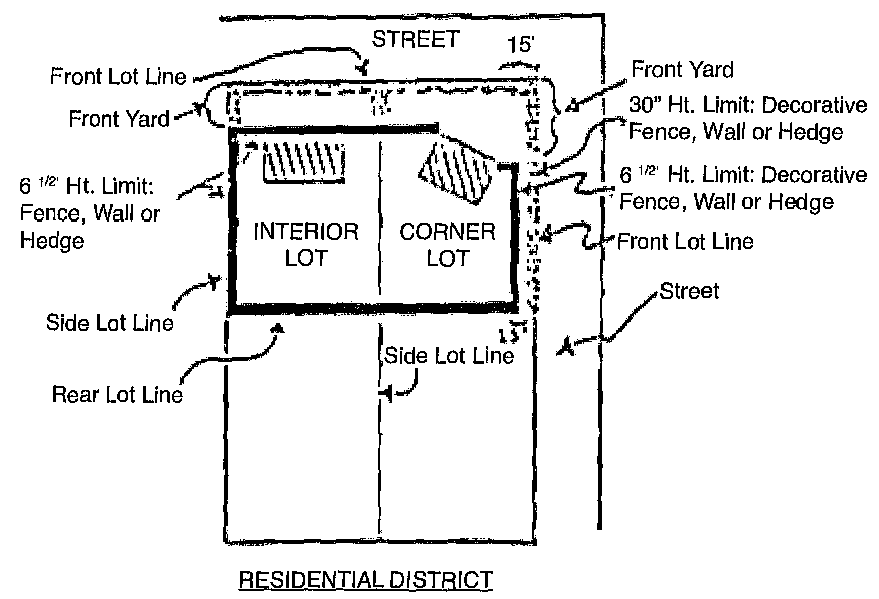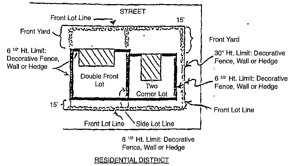 In any non-residential district, unless otherwise stipulated elsewhere in this ordinance, fences, walls and hedges may be permitted within or along the edge of any yard, provided such fence, wall or hedge erected or planted within a distance of fifteen (15) feet from or along the edge of the front lot line shall not exceed thirty (30) inches in height. (See illustration of typical lot configuration and application below.)
