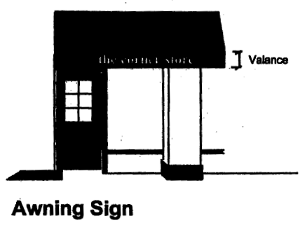 Signs shall be located either in the panel situated above the awning or transom windows, on the canvas awning, on the window or door glass, on the transom window area or on a small projecting sign.