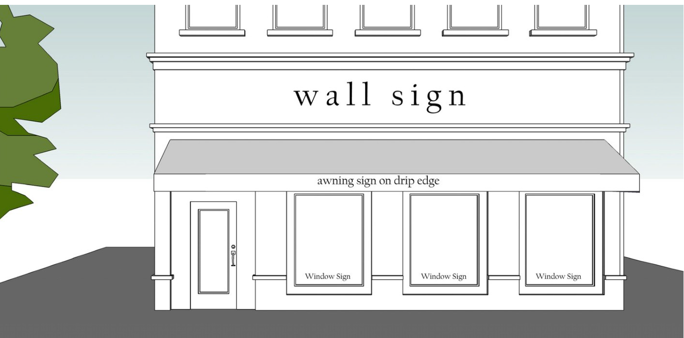 The painted window or door signs may be in addition to only one of the following: a wall-mounted sign, a freestanding sign, an applied letter sign, a projecting sign or a valance awning sign.