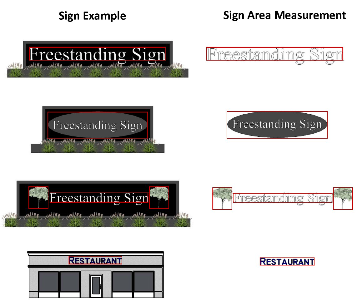 For permanent signs, except projecting and hanging signs, sign area shall constitute the entire area within a rectangle or the sum of rectangles enclosing the extreme limits of writing, representation, emblem or any figure of similar character, regardless of opacity or missing space within the "extreme limits." Any single row of text shall be grouped into one continuous rectangle. For freestanding signs that have a non-black background, the entire surface area is included.