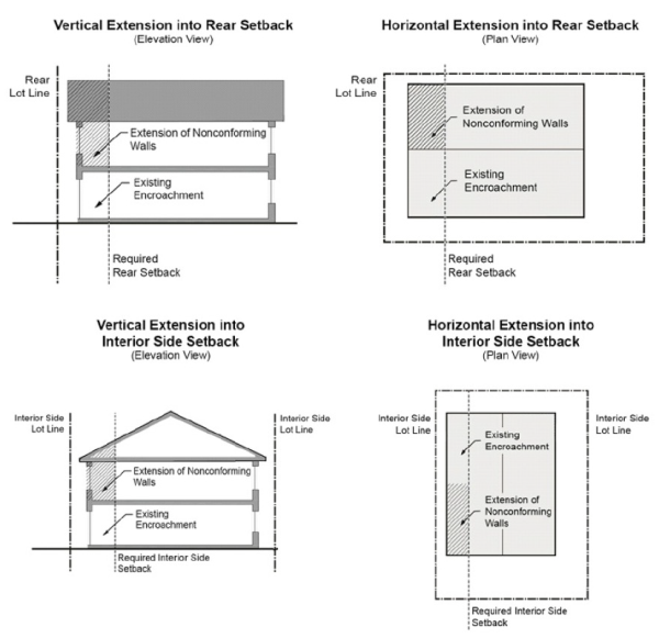Extension Of Walls For Nonconforming Single-Family And Two-Family Dwellings: Where a single-family or two-family dwelling is deemed nonconforming because of encroachment into a required rear or interior side setback, the structure may be enlarged or extended horizontally or vertically along the same plane as the existing perimeter walls, provided that the interior side yard setback is at least five feet (5') and the resulting structure does not violate any other district regulation.