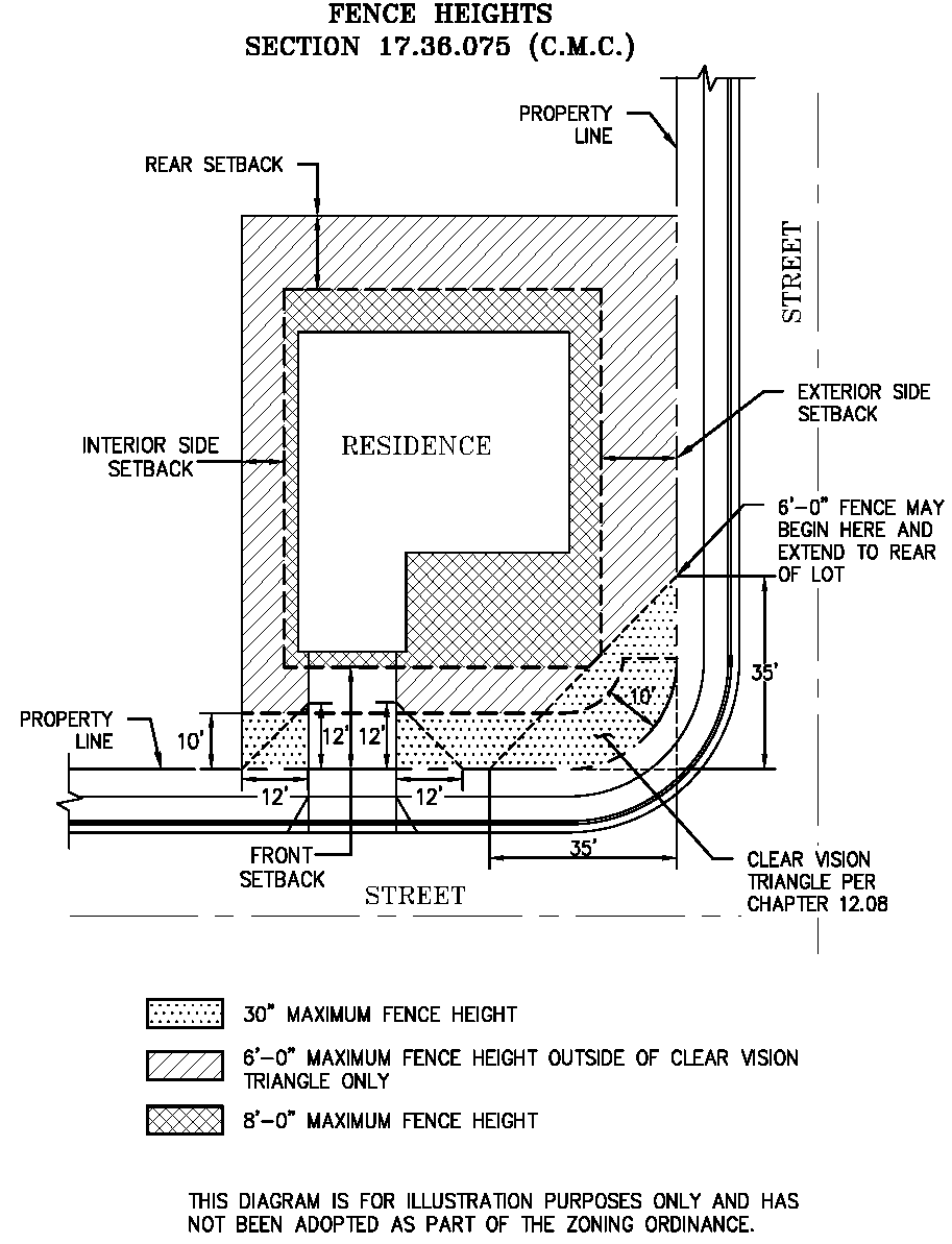 Front Setbacks. Fences shall not exceed a maximum height of thirty (30) inches within ten (10) feet of the front property line and a maximum height of six (6) feet in the remaining portion of the front setback.