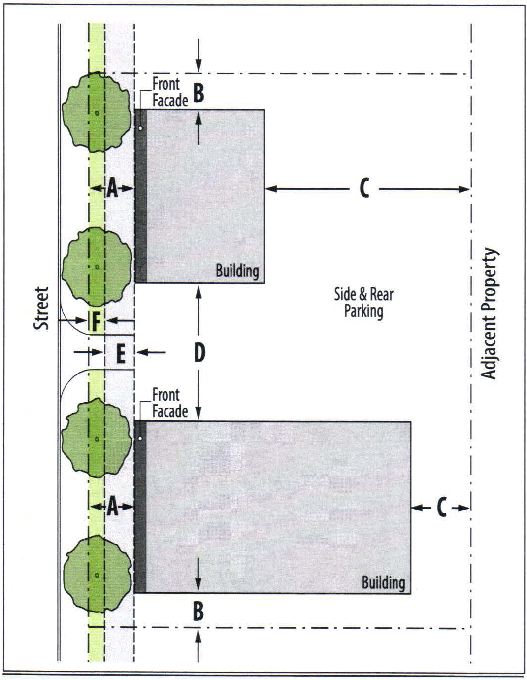 Street frontage standards in this section regulate conditions along the 5 street frontage types established in Section B-203. Street Frontage Types and include building setbacks and spacing, pedestrian and landscape improvements, parking and vehicular circulation, and front building facades and entries. The location and extent of each street frontage type is illustrated in Figure 1. Regulating Plan. Table 5. Summary of Street Frontage Standards provides an overview of requirements by street frontage type.