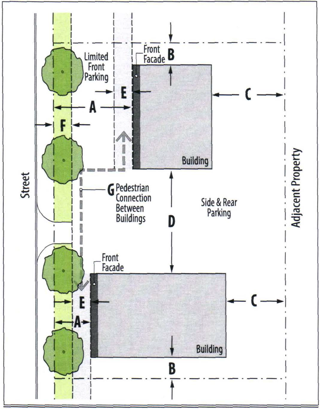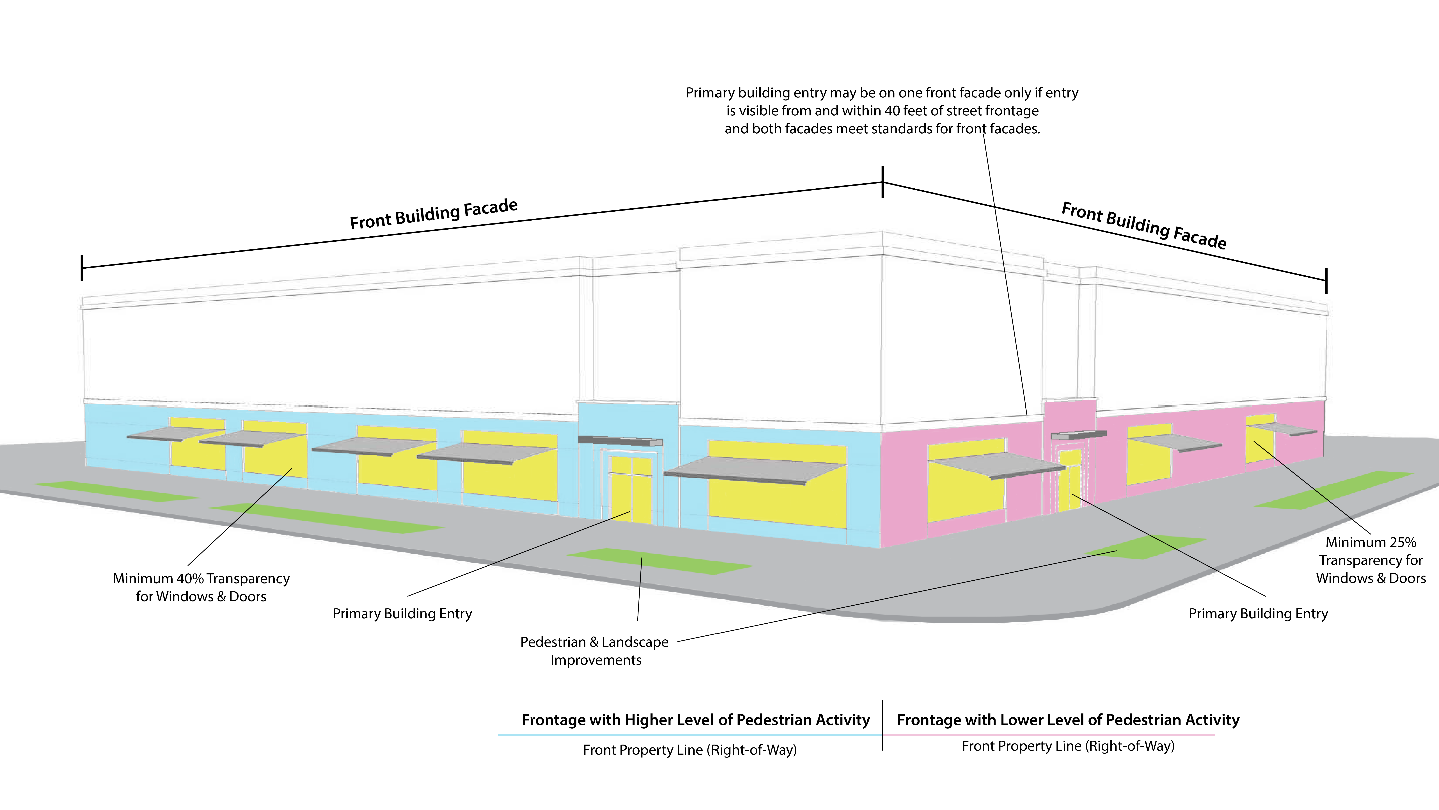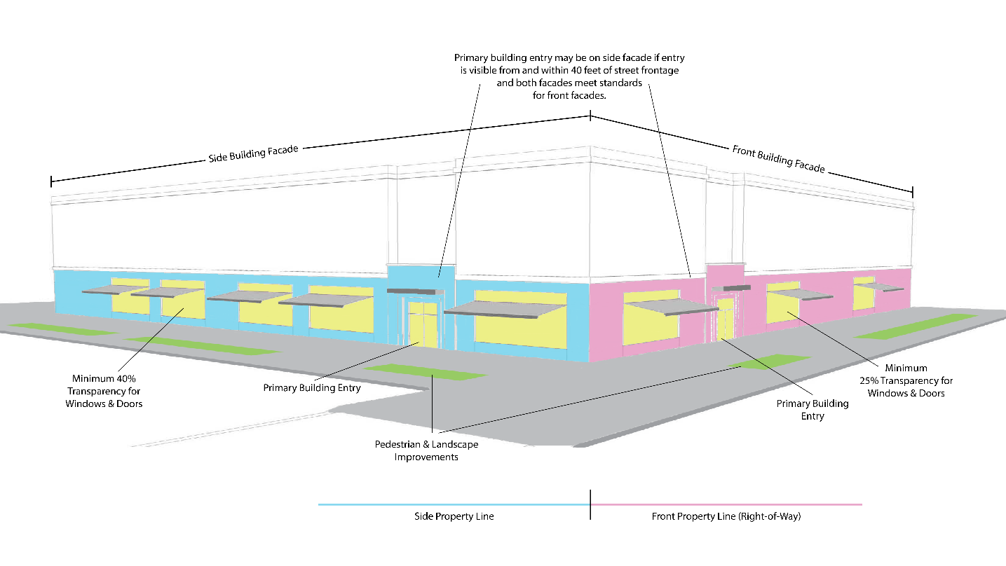 The Street Frontage Standards in Division 4 regulate building location and facade treatments, landscaping, pedestrian improvements, and parking treatments along street frontages.