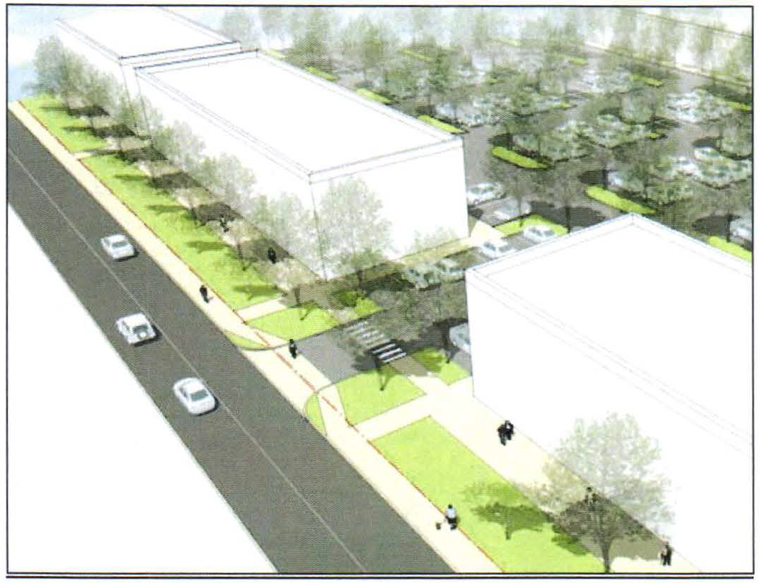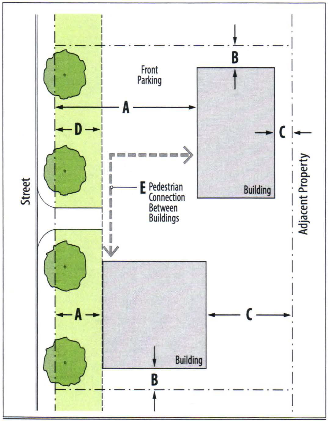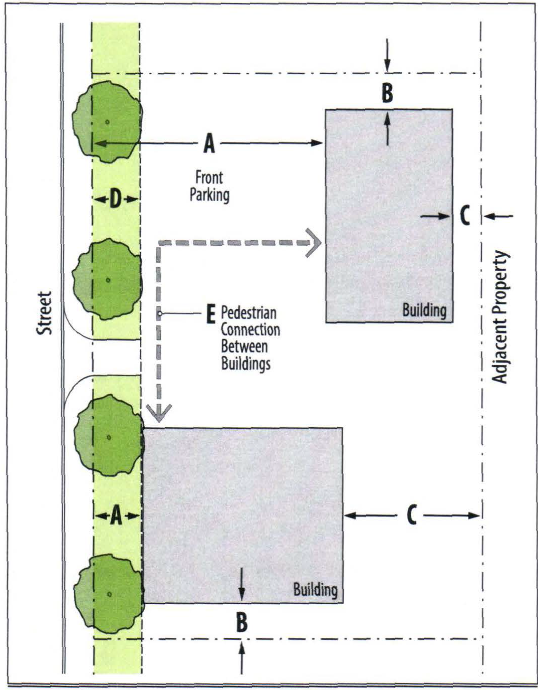 The Street Frontage Standards in Division 4 regulate building location and facade treatments, landscaping, pedestrian improvements, and parking treatments along street frontages.