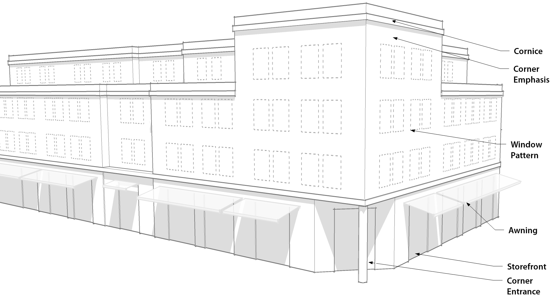The Building Design Standards in Division 6 regulate the treatment of front building facades, building entries, and other features related to the architectural design of buildings.