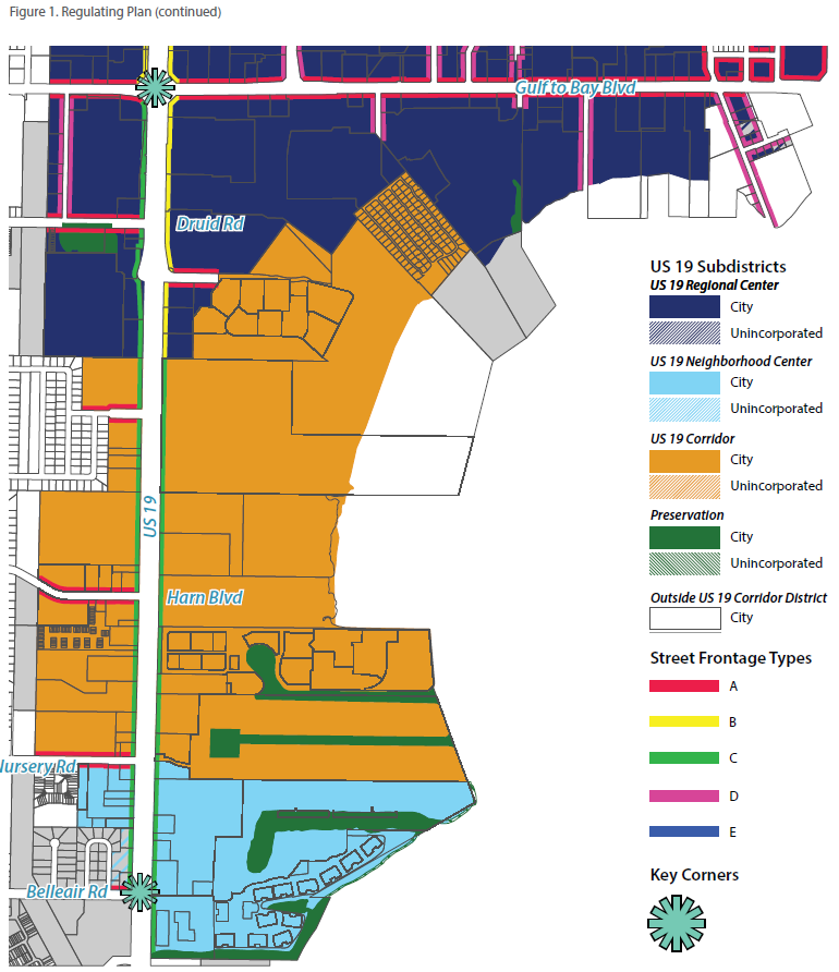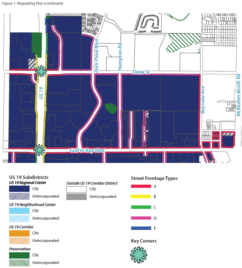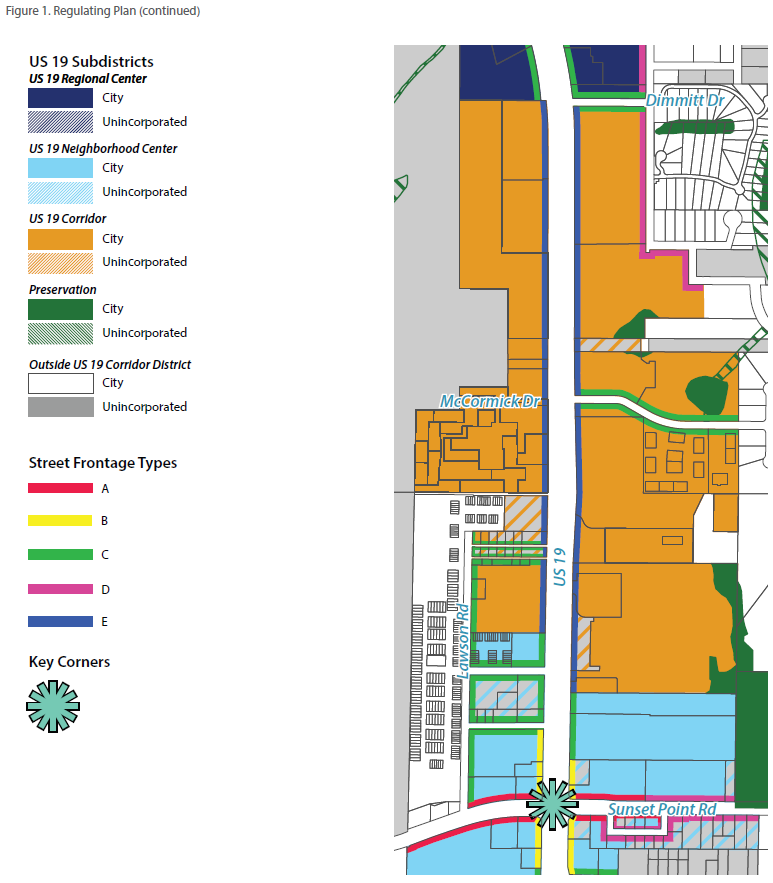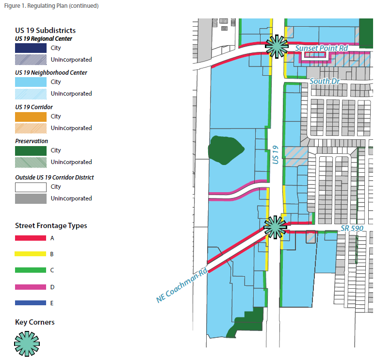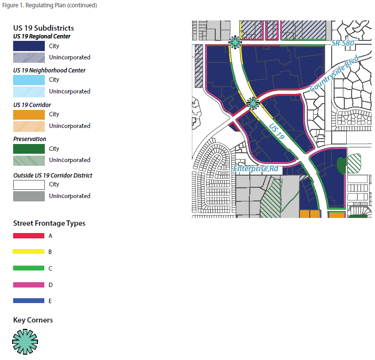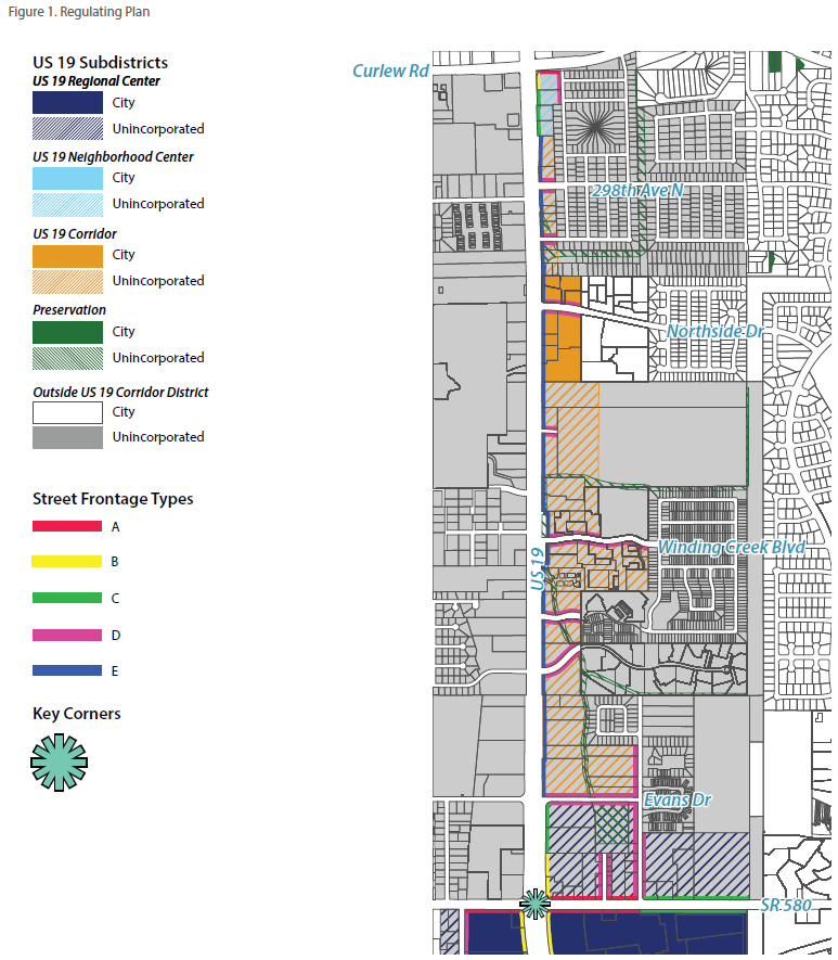 Development within the US 19 District is regulated by subdistrict and street frontage type as shown in Figure 1. Regulating Plan and described below.