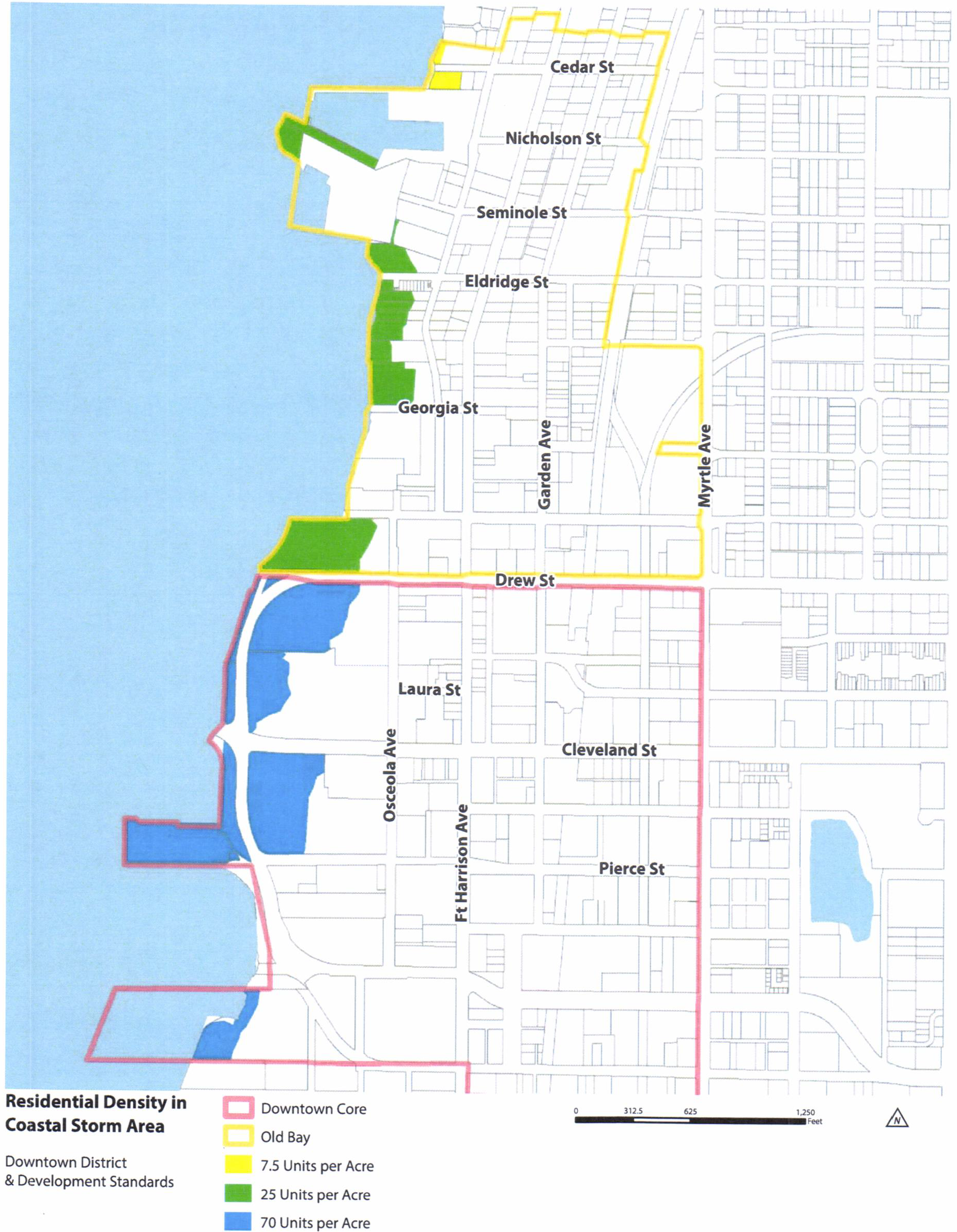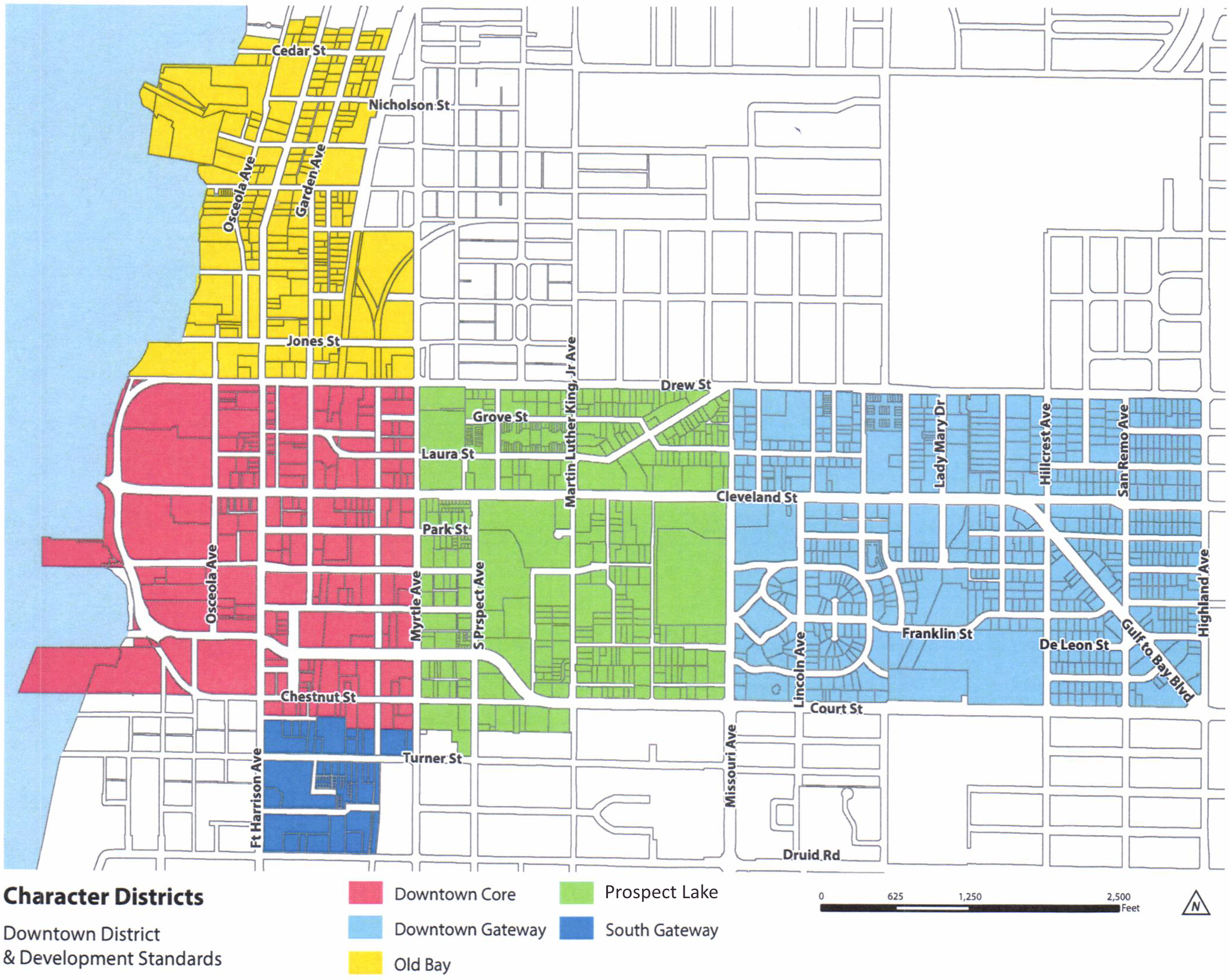 Old Bay Character District. The Old Bay Character District is intended for moderate intensity residential development and mixed-use development in buildings with entries opening onto pedestrian-friendly streetscapes. Standards are designed to preserve the District's unique and charming character, while providing a transition between the high intensity mixed-use areas in the Downtown Core Character District and residential neighborhoods to the north outside of the Downtown District boundaries. Buildings with active ground floor uses along North Fort Harrison Avenue are designed with façades aligned along public sidewalks and parking and service areas primarily located behind buildings. In the remainder of the District, buildings are designed with façades aligned along streets with modest setbacks and with parking and service areas primarily located behind buildings. Properties adjacent to the Pinellas Trail are designed to provide pedestrian and bicycle connections to the Trail.