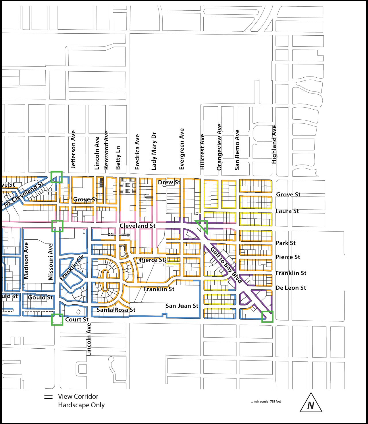 View Corridors. The view corridor at the western terminus of Nicholson Street shall be preserved through an open space corridor the width of the Nicholson Street right-of-way. The corridor shall extend to the west to the mean high water line. Hardscaping improvements may occupy this space provided the height does not exceed the average pre-development grade of the property within the open space corridor. View corridors are shown on Figure 2. Regulating Plan—Street Types and Key Corners.