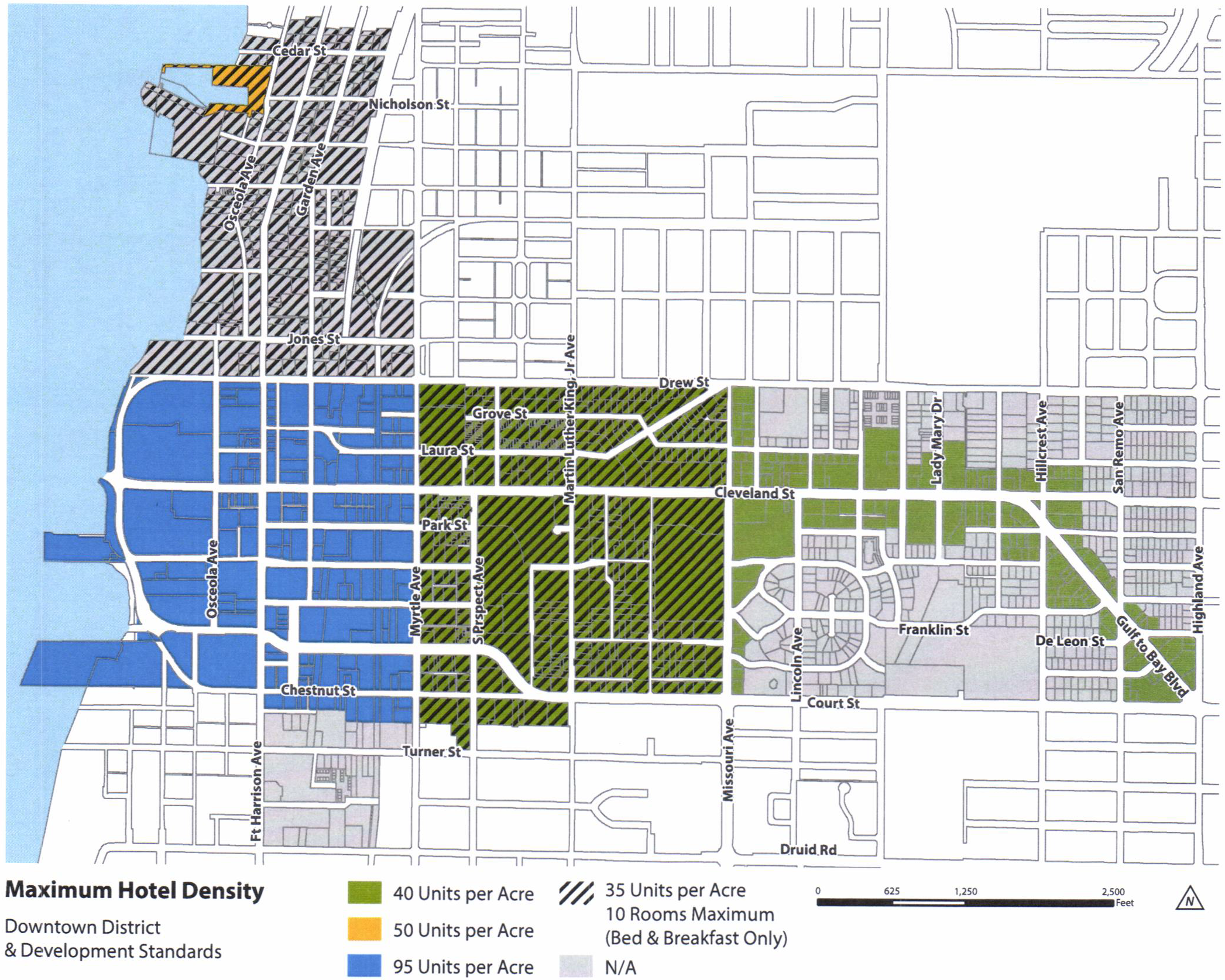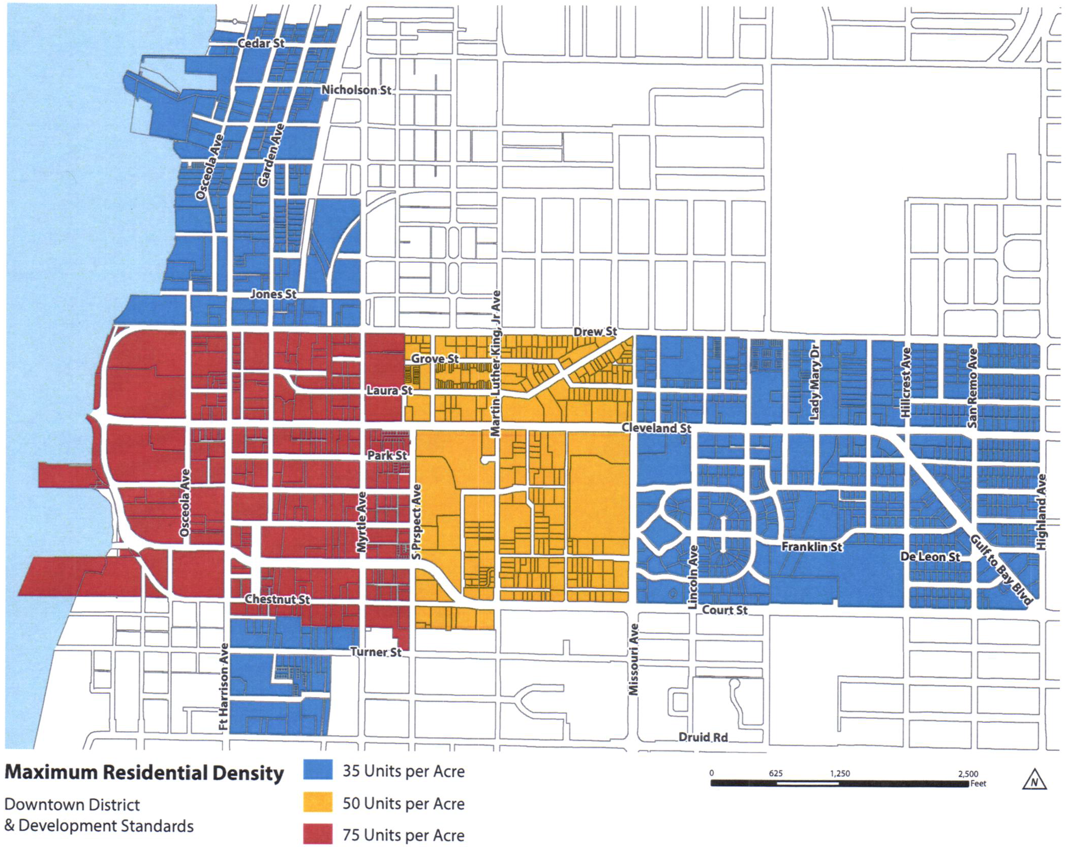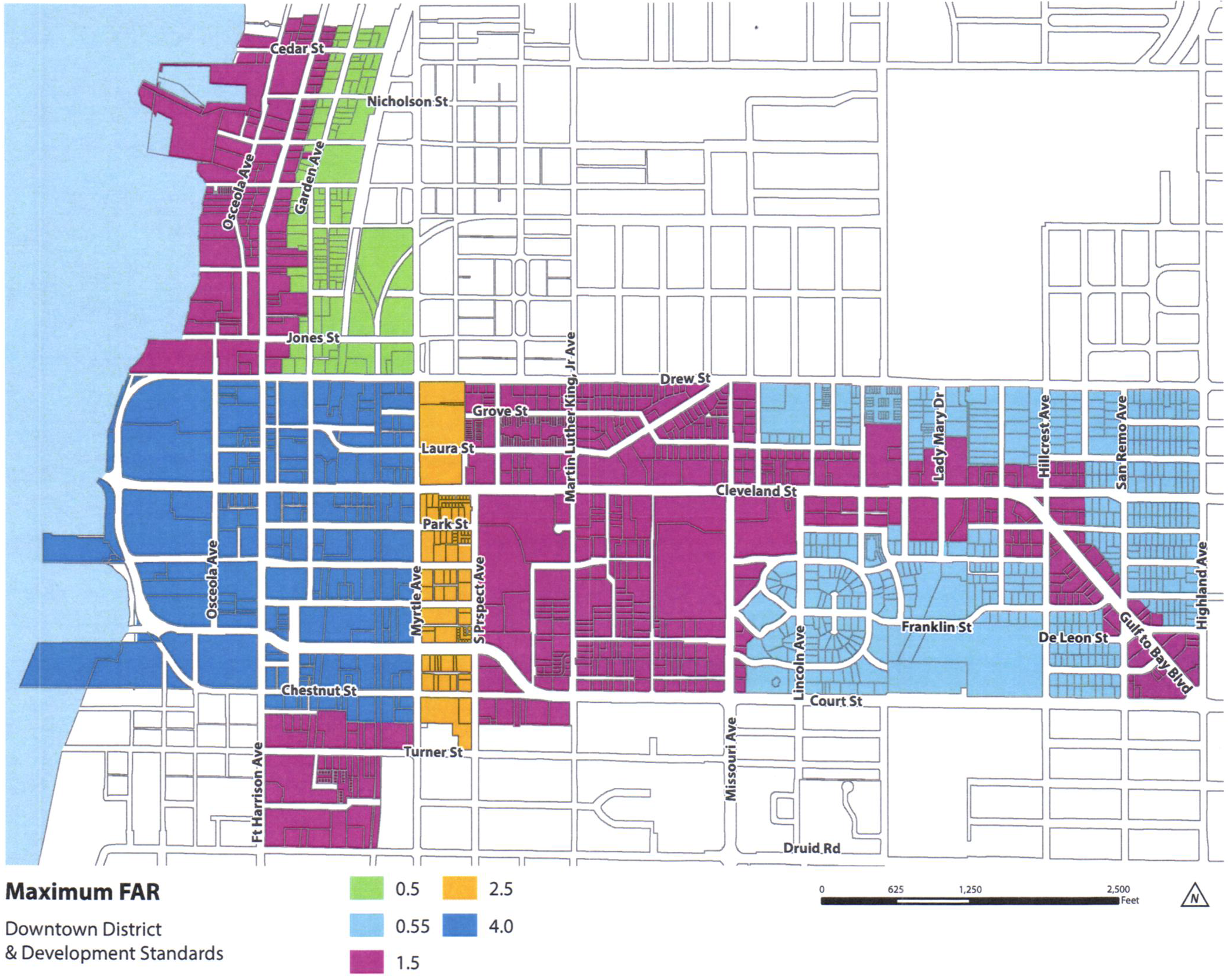 Development in the Downtown District shall be consistent with the development potential set forth by location in the Clearwater Downtown Redevelopment Plan. Properties within the Downtown District shall have a future land use of Central Business District (CBD), which is consistent with the Activity Center (AC) Countywide Plan Map category and the Special Center subcategory in the Countywide Plan for Pinellas County. The maximum development potential set forth for each established character district is shown on Figures 3 through 7. Residential uses and overnight accommodation uses are regulated by density, or units per acre, while nonresidential uses are regulated by intensity, or floor area ratio (FAR). The development potential for mixed-use projects shall be determined consistent with Section 3-902.
