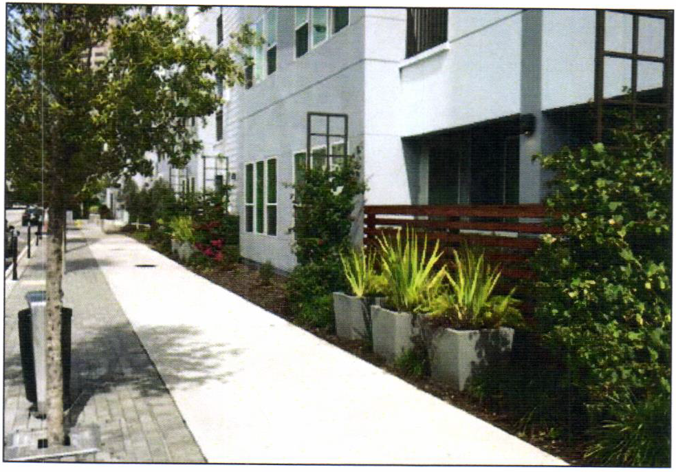Flexibility in the application of landscaping standards in front setbacks on buildings with Storefront 2, Urban Residential 1, Urban Residential 2, Neighborhood Infill and Neighborhood Conservation Frontages found in Section C-407.C, Section C-408.C, Section C-409.C, and Section C-410.C may be approved if pedestrian orientation is not adversely impacted and site functionality is improved.