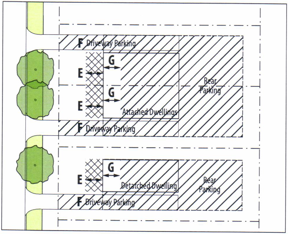 Frontage Standards—Attached and Detached Dwellings along Street Types E and F. Flexibility in meeting frontage requirements found in Section C-409 and Section C-410 for attached or detached dwelling projects may be approved if a project utilizes innovative building types or styles such as bungalow court configurations, carriage houses, or the like.