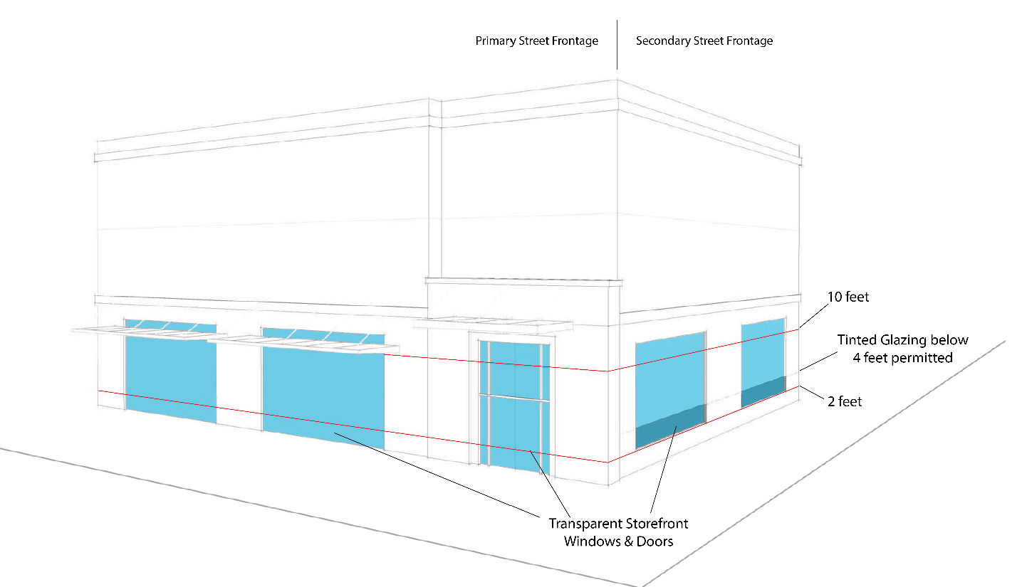 For buildings with multiple street frontages, required glazing below 4 feet along secondary street frontages may be exempt from the daylight reduction (tinting) standard required for buildings with Storefront 1, Storefront 2 or Workshop/Flex Frontages. No reflective or mirrored coating or treatments are permitted. These flexibility provisions are illustrated in Figure 70. Frontage Design Flexibility.