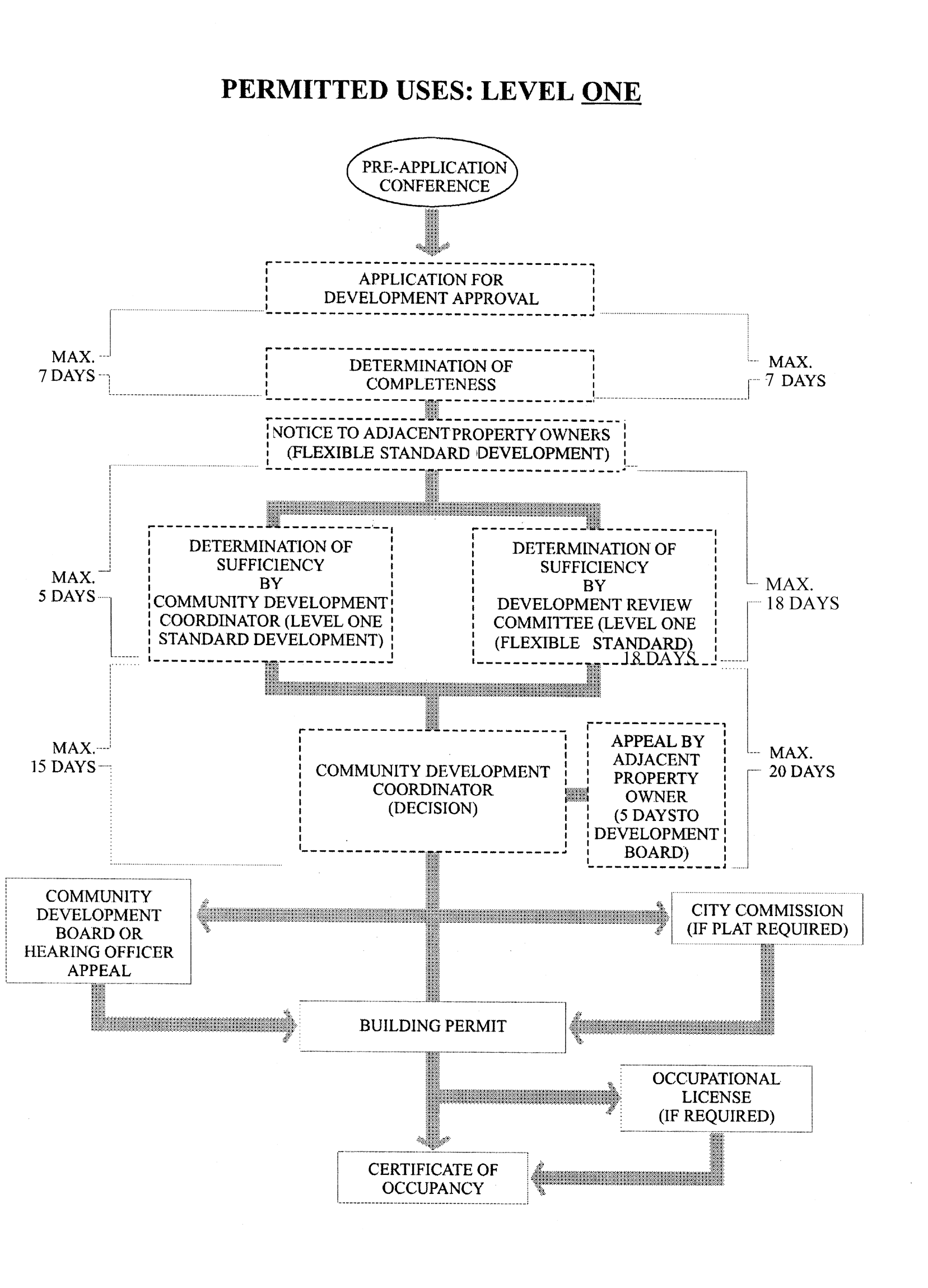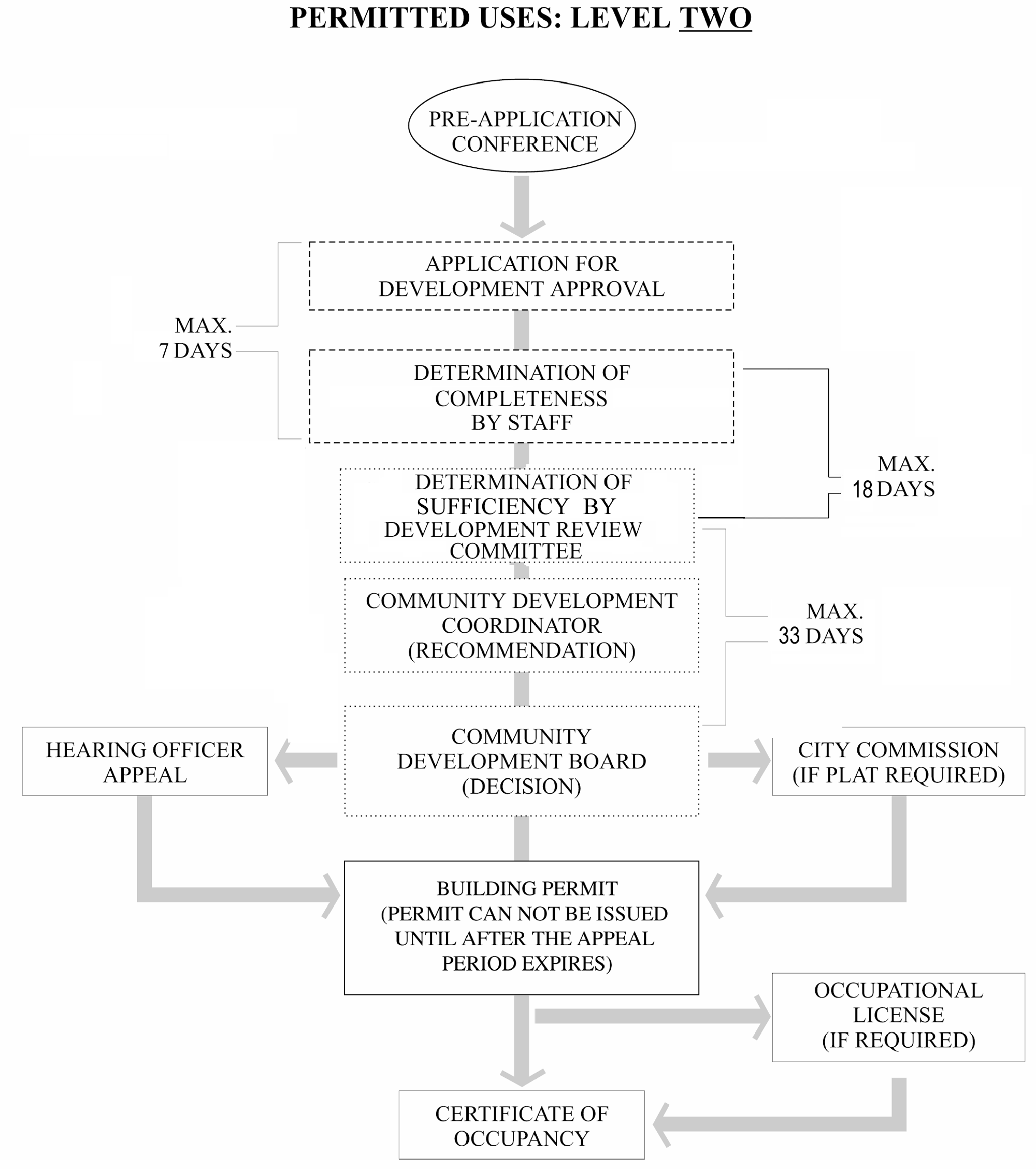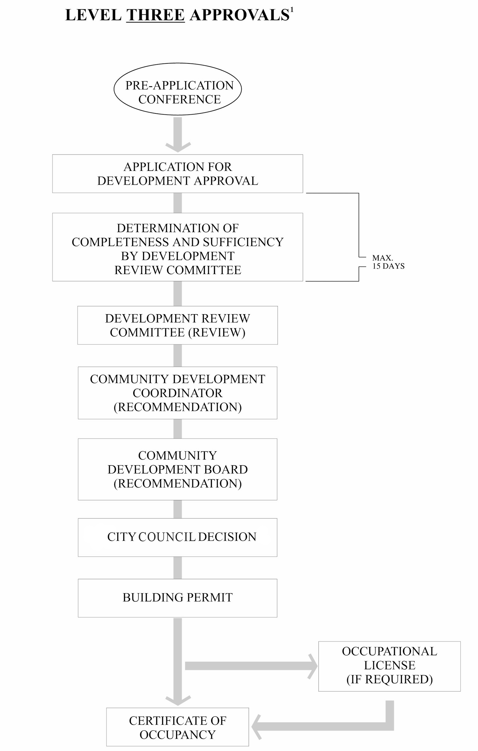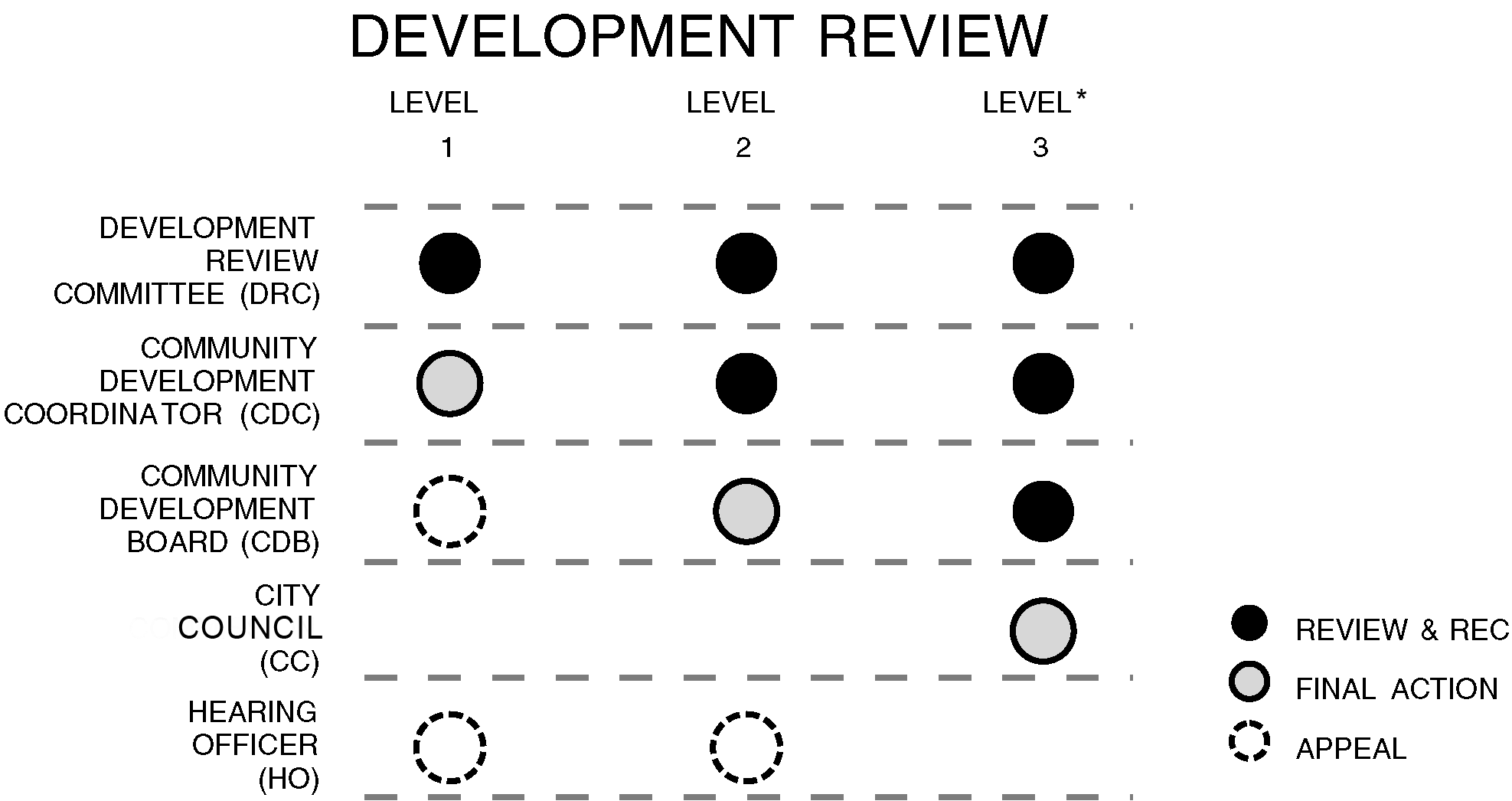 This Development Code establishes the following types of development approvals: Level One, Level Two, and Level Three. Level One approvals involve those development proposals which are reviewed and approved by the city's professional staff. Level Two approvals are those development proposals which are more complex and involve the use of greater discretion by an appointed board accountable, through the appointment process, to the city commission. Level Three approvals are those approvals which state law requires action by the city council because they involve issues of public policy in the first instance. The following graphic portrays this concept of different levels of approval: