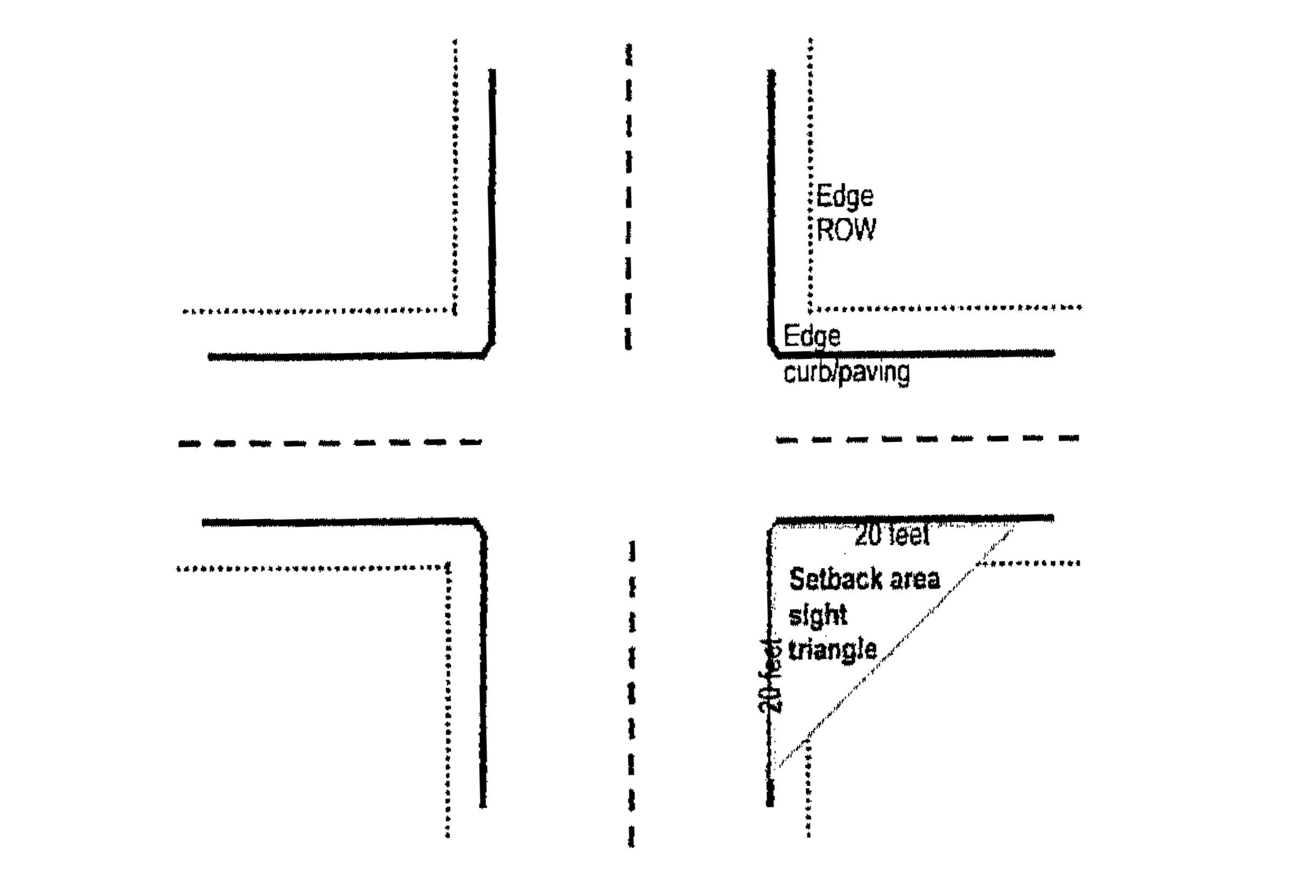 Unless stated otherwise in this article, permanent signs shall be set back at least ten feet from all property lines. Signs on corner lots shall be set back 20 feet from the edge of the rights-of-way of intersecting streets so as to preserve the a sight triangle. The sight triangle is the area of visibility required on a corner to allow for the safe operation of vehicles, pedestrians and cyclists in the proximity of intersecting streets, sidewalks and bicycle paths. The city may require a greater setback because of public safety reasons that may include, but not be limited to, the following concerns: vehicle sight-distances, distance from an intersection, or function of the adjoining right-of-way.