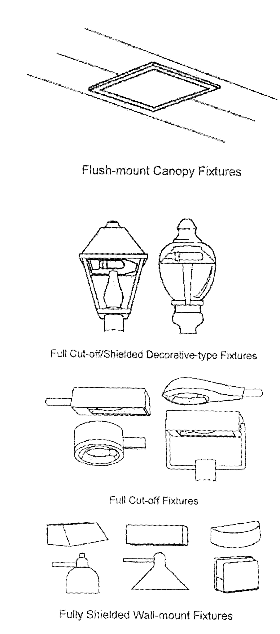 Use of a low intensity high-quality light, which will provide good, uniform visibility while avoiding light pollution. All fixtures should be full-cutoff or shielded type fixture (wall pack fixtures are not acceptable) for all building lighting for security or aesthetics. Floodlighting is discouraged, however, if used it shall be shielded to prevent the following: