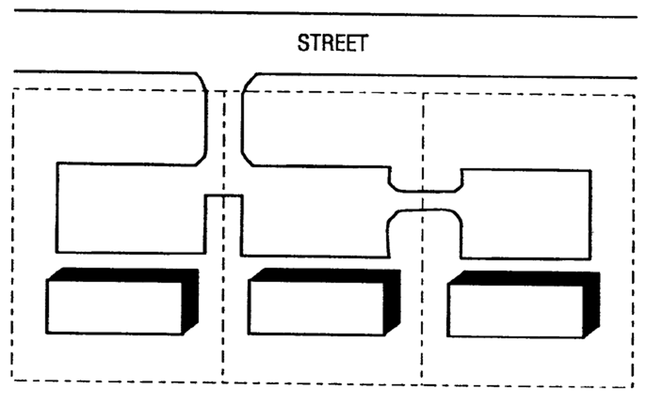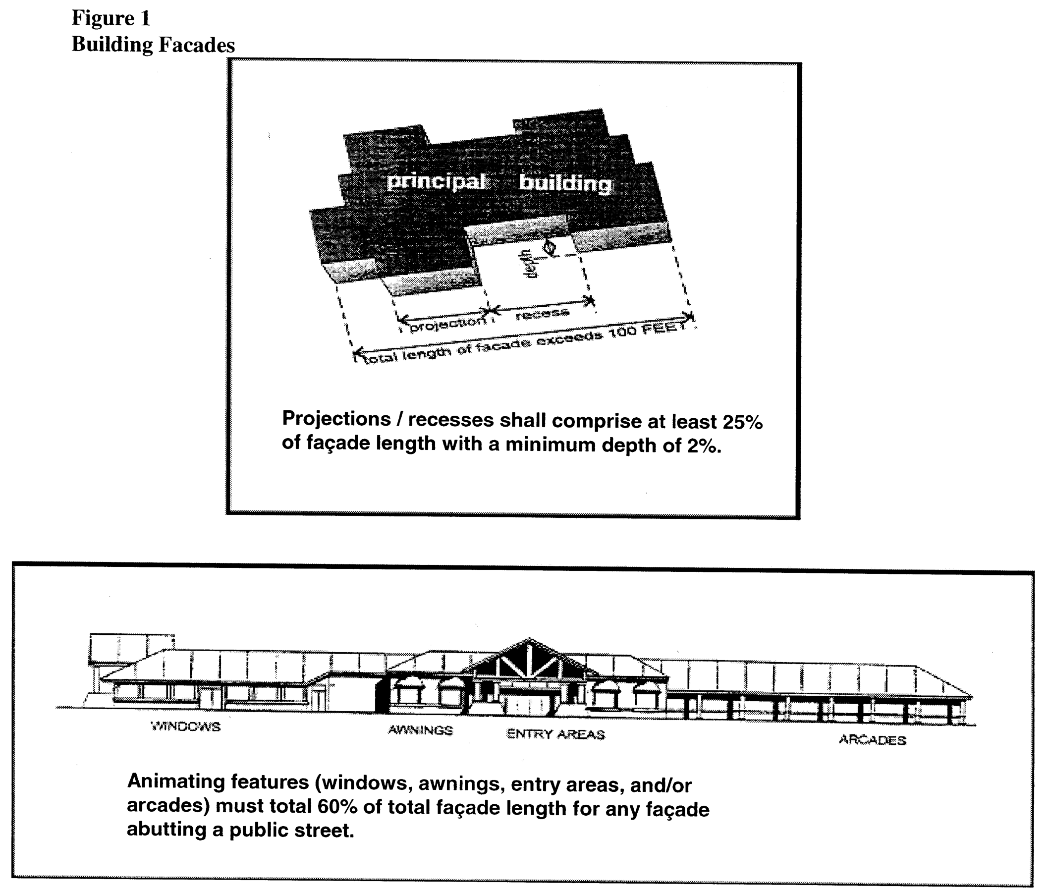 Ground floor facades that face public streets or public ways shall have arcades, display windows, entry areas, awnings and other such design features along no less than sixty (60) percent of that facade. This requirement includes the facade of the building that functions as the rear, yet faces a street. See Figure 1.