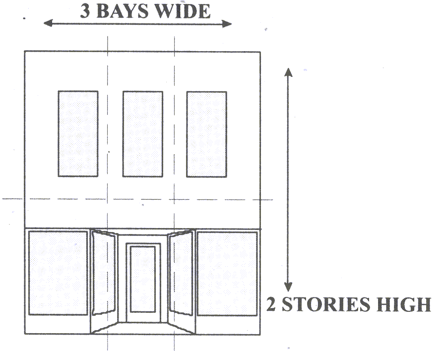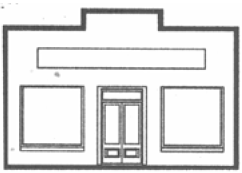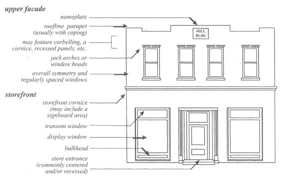 Store front The simplest type of commercial building is the store-front, names for the traditional use of its first floor. On buildings more than one story high, the upper level often serves a different use and features the elements common for upper facades. One-story storefronts are common in the historic district and often appear in twos and threes.