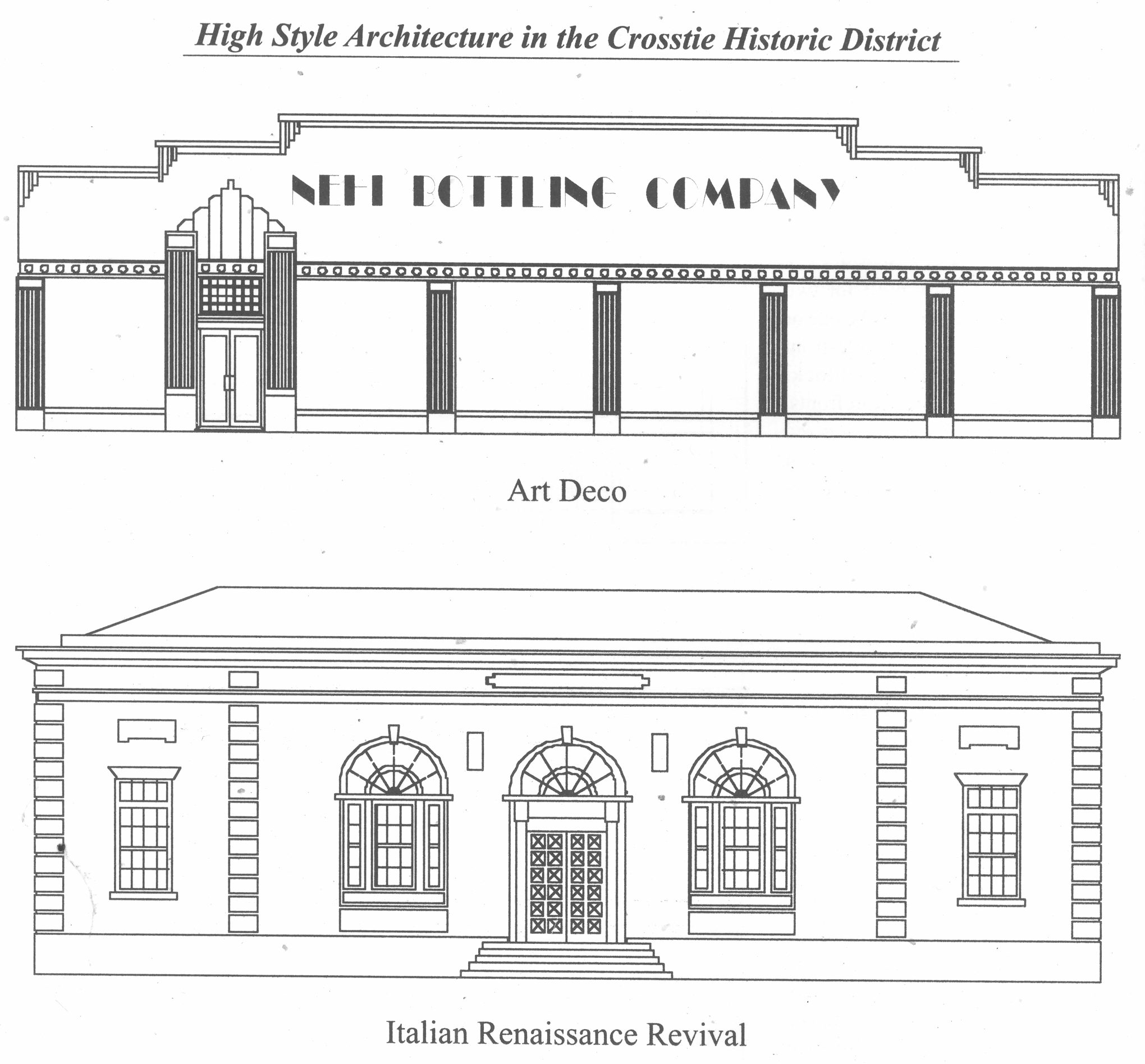 The majority of buildings in the Crosstie Historic District are vernacular or have elements of an architectural style. Only a few structures exhibit clear high style construction. High style examples include the Post Office (now the Police Station), the Coca Cola building, the Nehi building, and the Regent and Ellis theaters.