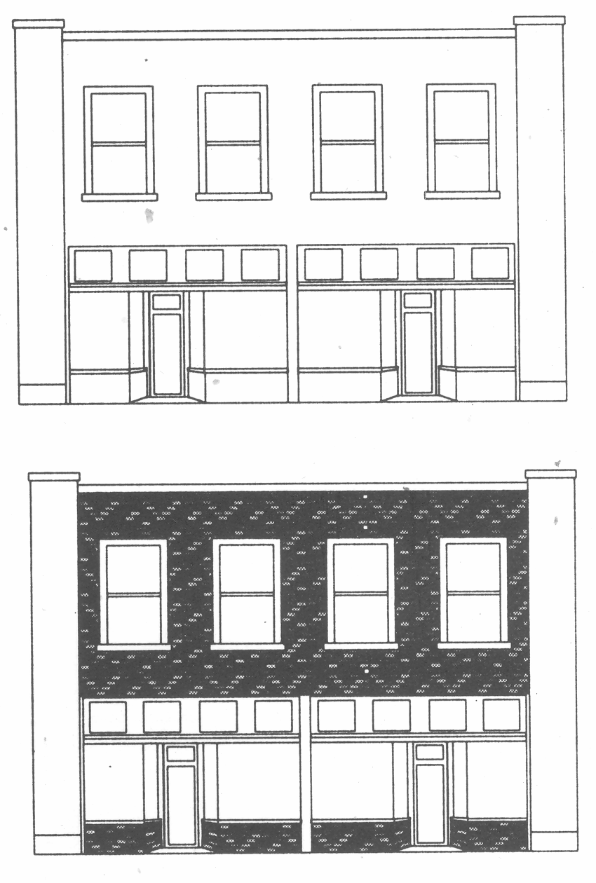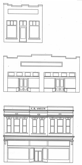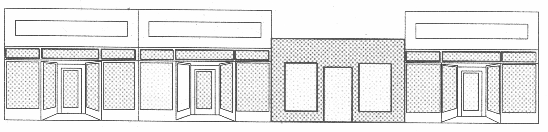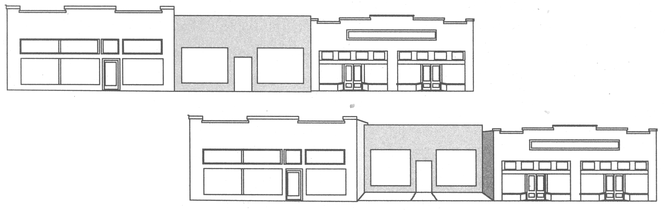 Principle 4:Replacement storefronts should follow the established traditional pattern. If the original storefront is too deteriorated to save, the replacement should accurately replicate the original. Where the original storefront no longer exists, the replacement should be based on historical research and physical evidence. Where no documentation exists, a new storefront should be designed which is compatible with original storefronts of adjacent and nearby historic buildings.