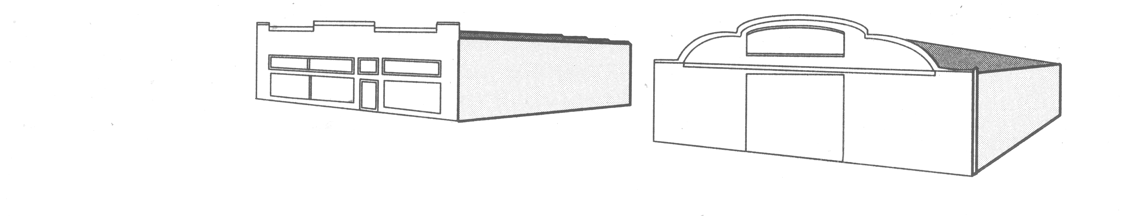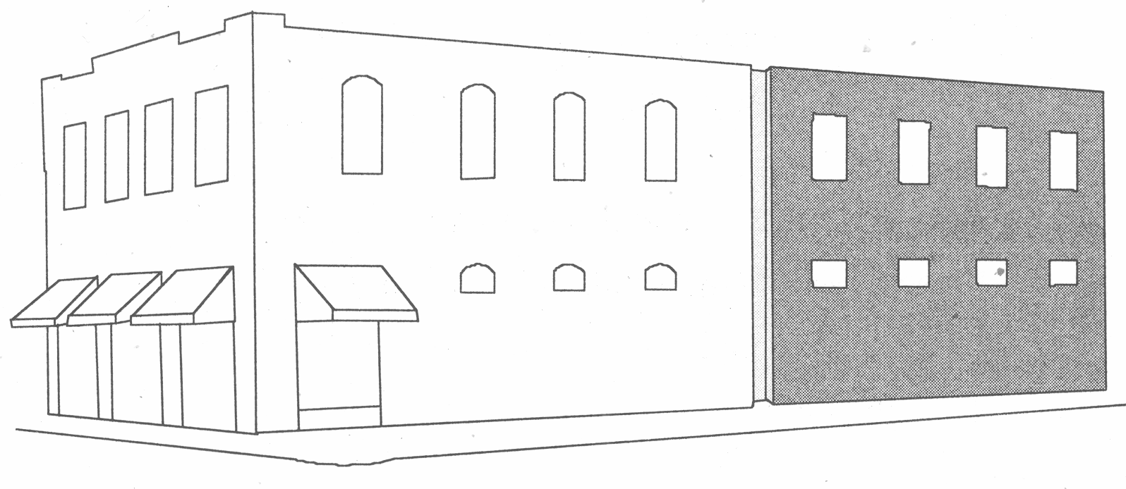 Principle 1:New construction should incorporate building forms that reflect the established form of the historic district. A dominant component of form is the roof and its shape, pitch, and complexity. Other ingredients are the height of the foundation, story heights, and whether a building is composed of a single block or several small blocks. Downtown buildings are primarily one single block with rectangular silhouettes and footprints. Parapets provide the only relief, or change in shape, to this geometric pattern. New buildings should feature parapets.