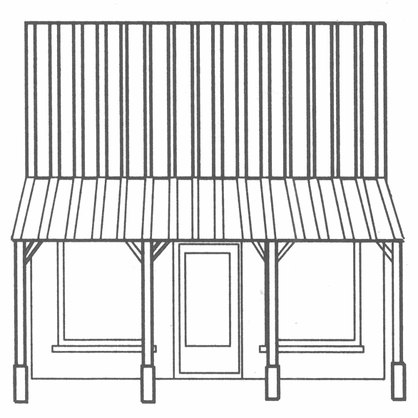 Principle 3:The design of new awnings, canopies, and porches should be appropriate to the architectural character and historic documentation of the building and district. Inappropriate "theme" examples added during recent years are best removed or incorporated into a more appropriate design. Simple shed porches with wood posts reflect the earliest porches. For most buildings, awnings are the appropriate design; however, awnings would not be compatible for some early twentieth century buildings, which utilized flat, suspended metal canopies to reinforce their horizontal lines.