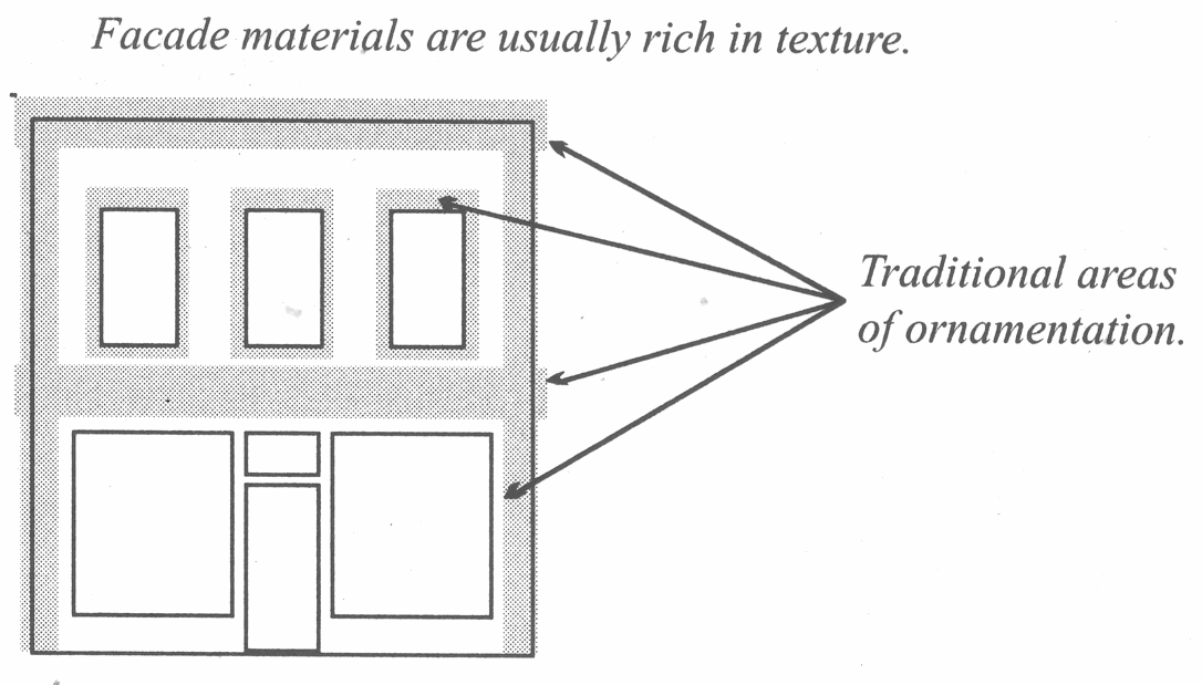 Materials and ornament have a significant impact upon visual character. Materials form the surface or walls of the building. The type of materials used defines a building in terms of both texture and color. In addition, ornamentation accentuates different portions of the building. The proper use of materials and ornamentation can allow a new building to become a contributing member of the historic district while introducing its own identity.