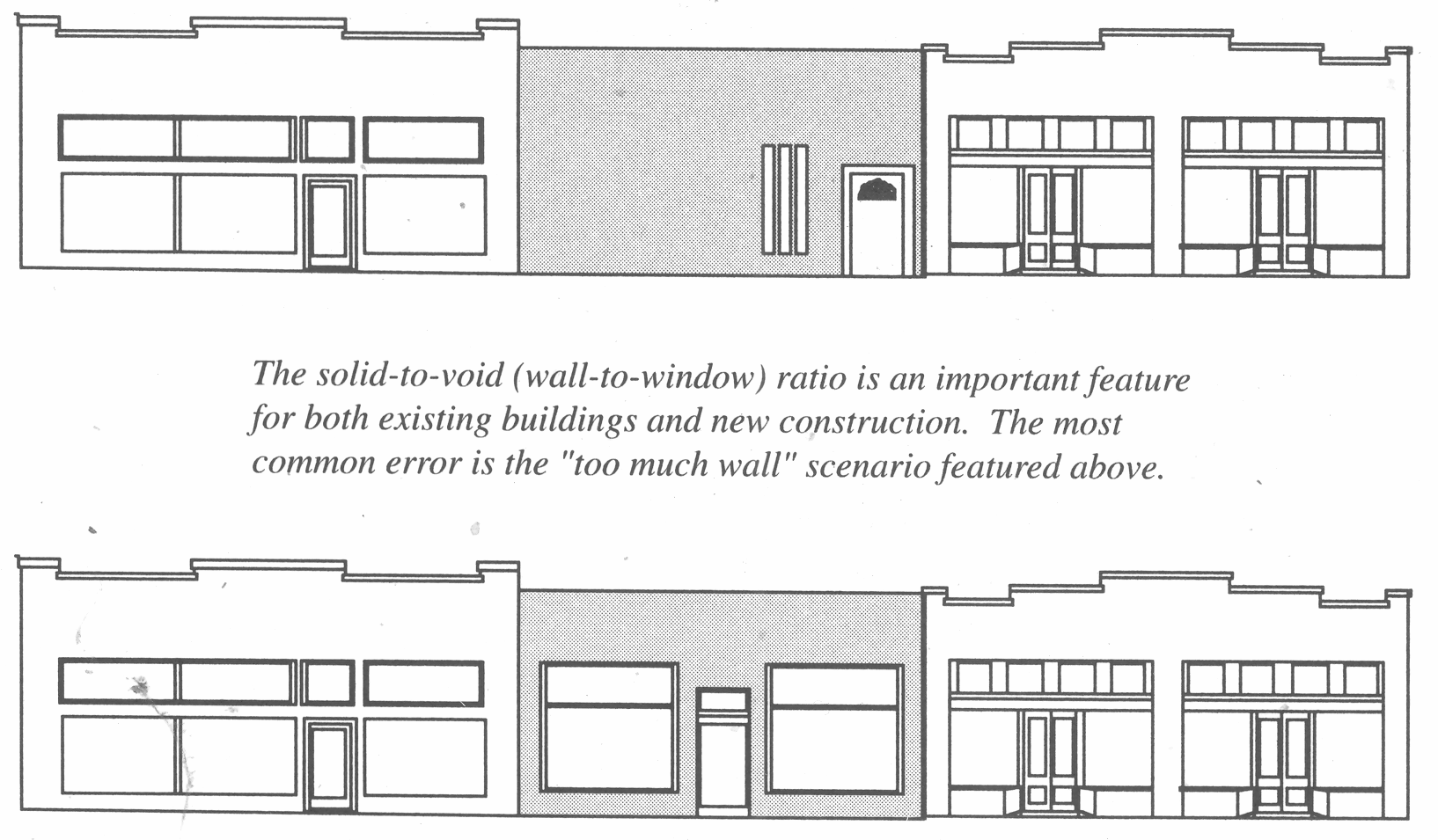 Principle 1:New buildings should carefully reference the historic use of façade elements. Storefronts, entrances, and window openings pierce the walls and create voids upon a building's façade that creates a rhythm along the streetscape. These façade elements, with a few minor variances, generally align along a block. Most buildings also emphasize façade symmetry. Openings on the façade of new buildings should follow the example established by surrounding historic buildings. Quantity and placement of openings in new buildings is extremely important. New buildings should carefully balance solid and void.