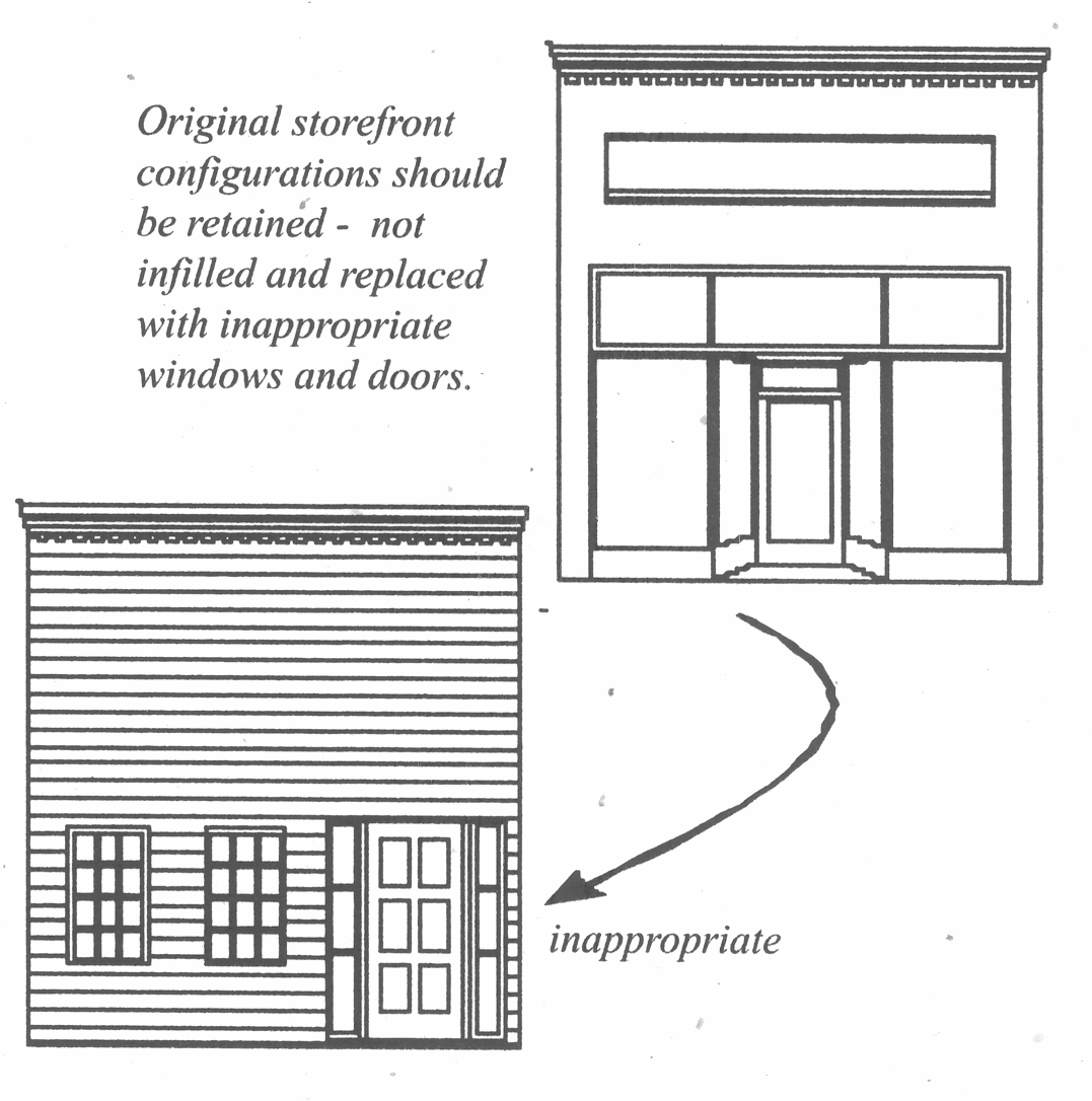 Principle 3:Original storefront configuration and materials should be preserved and maintained. Storefronts should not be covered or enclosed. Entrances should not be relocated or infilled. Display windows and transoms should not be enclosed, replaced with a different window type, or covered with a false front.
