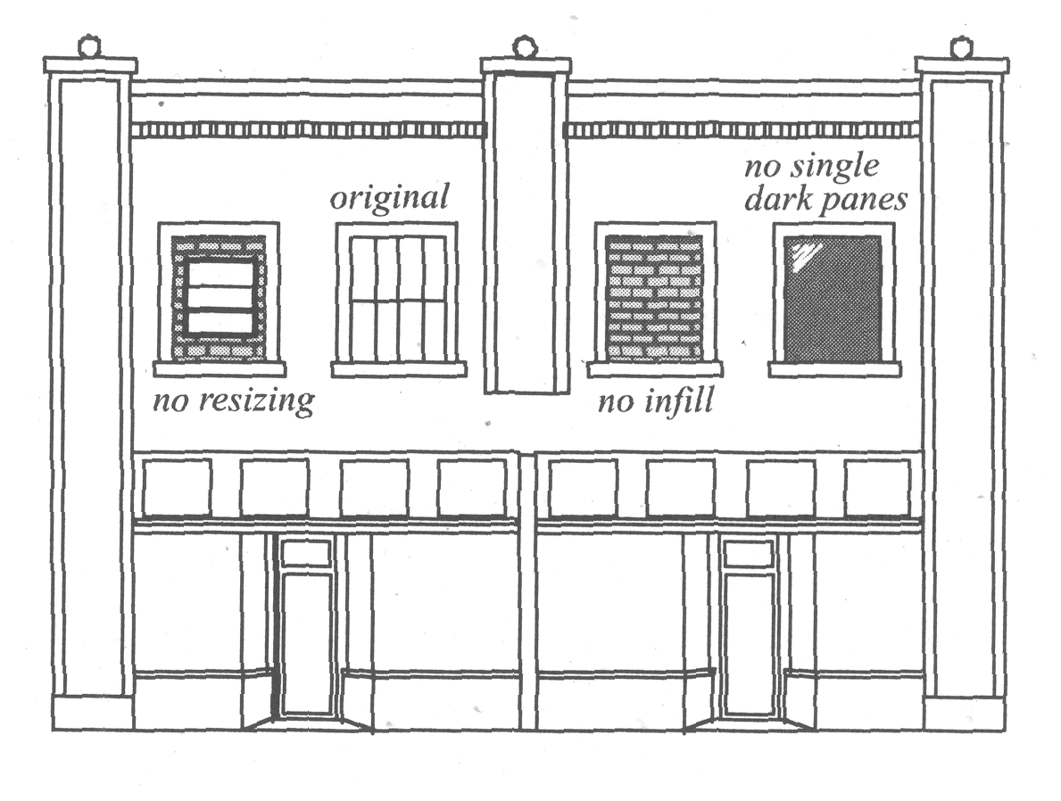 Principle 11During rehabilitation and renovation, the original window materials and design should be retained. Though in their original state historic windows do not equal today's standards of energy efficiency, they should not be replaced. Efforts to increase energy efficiency and the operation of windows should keep the historic components intact. Window openings should not be enclosed, covered, or partially infilled for the installation of different shape or size windows. Additional window openings should never be added to the front of a building. During renovation efforts, enclosed and covered window opening should be reversed and inappropriate replacement windows removed.