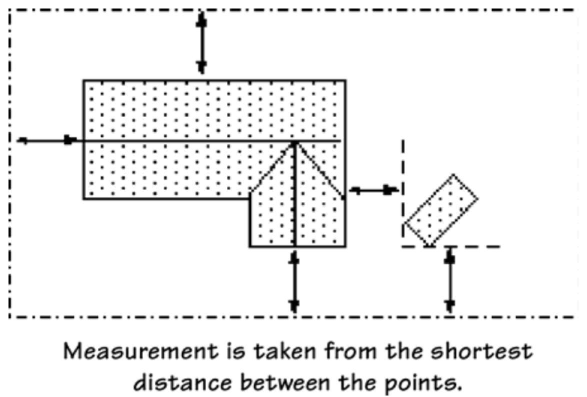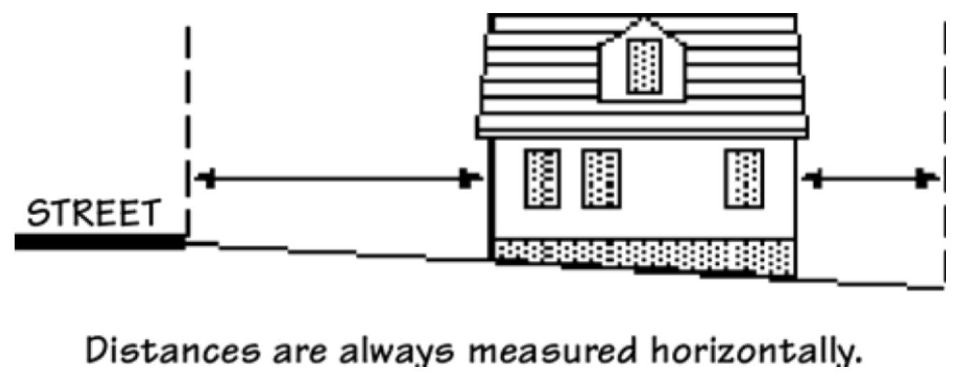All distances specified in this appendix shall be measured in a horizontal plane (see Figure 2-5-1). When measuring a required distance, such as the minimum distance between a structure and a lot line, the measurement is made at the shortest distance between the two objects (see Figure 2-5-2).