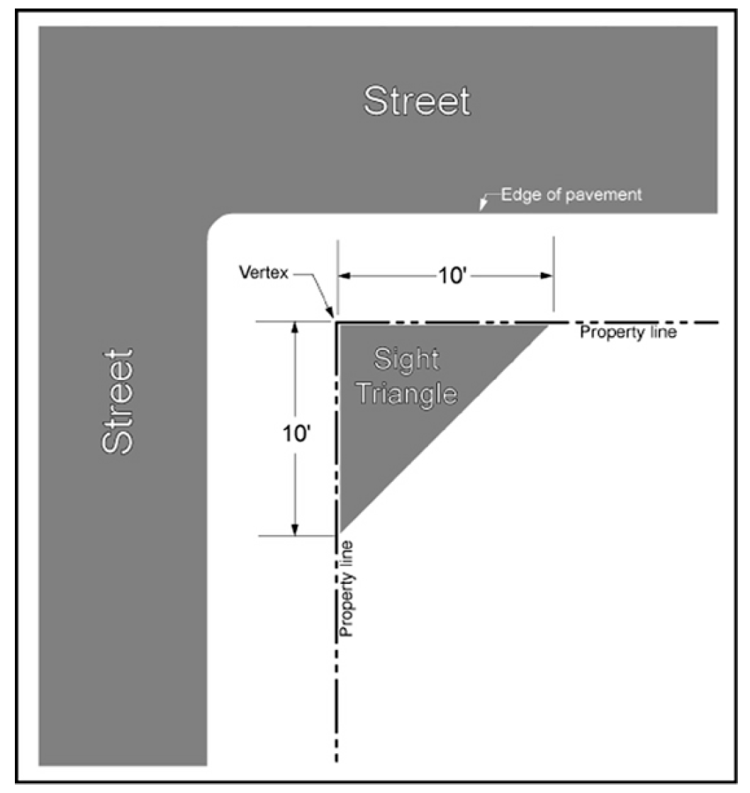 That portion of a corner lot, in any zoning district, lying within a triangle area formed by measuring from the vertex of that portion of the property line adjacent to the intersecting streets, to a point on each property line running from the vertex equal to ten feet, and then connecting the two points thus established with a third line (see Figure 2-9-1);