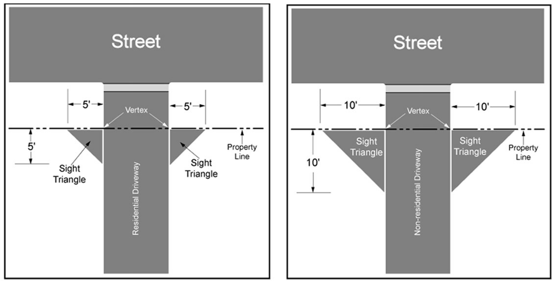 A triangular area formed by a diagonal line connecting two points located on a right-of-way line and the edge of a driveway, with such points to be equal to five feet from the intersecting lines for residential driveways, and ten feet from the intersecting lines for non-residential driveways (see Figure 2-9-2).