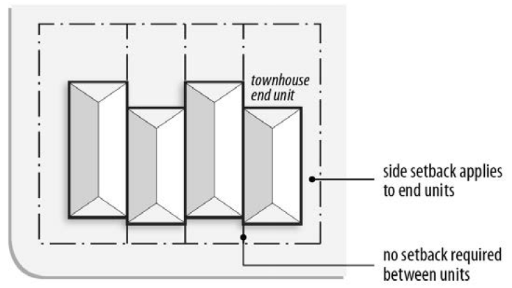 No interior side setback is required for interior units in townhouse developments. Side setback applies to end units (see Figure 10-1).