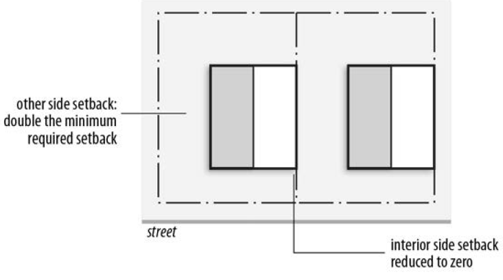 The interior side building setback on one side of the lot containing a lot line house may be reduced to as little as zero. The zero or reduced setback side of a lot line house may not abut a street and may not abut a lot that is not part of the lot line house development. On the "non-zero" side, a side building setback must be provided equal to at least twice the minimum side building setback requirement of the subject zoning district.