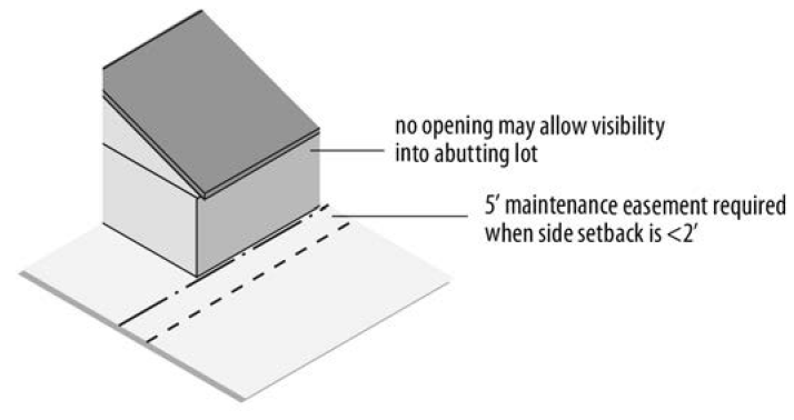 When a lot line house's exterior wall or eaves are within two feet of the abutting property line, a perpetual maintenance easement at least five feet in width must be provided on the abutting lot, which, with the exception of walls and/or fences, must be kept clear of structures. The easement must be depicted on the plat and established in the deed of dedication accompanying the plat. This provision is intended to ensure the ability to conduct maintenance on the lot line house. Eaves on the side of a lot line house with a zero or reduced setback may project over the side property line only if shown on the easement required under this paragraph.