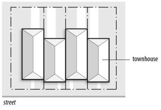 Townhouse. A townhouse building is a principal residential building containing multiple dwelling units, each located on its own lot with a common or abutting wall along the dwelling units' shared lot lines. Each dwelling unit has its own external entrance.