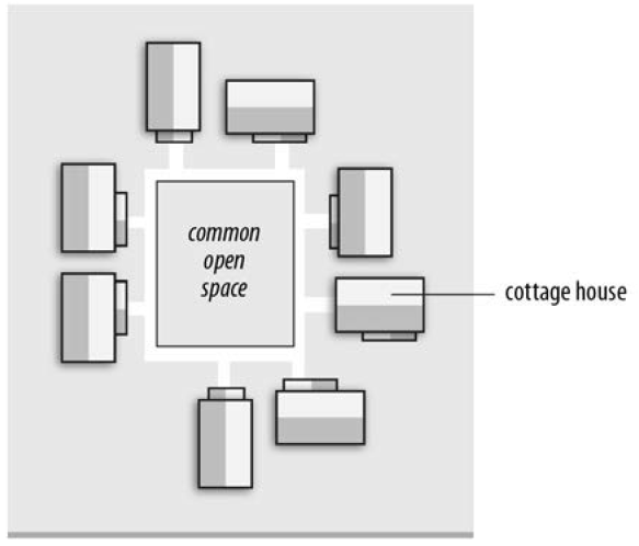 Required courtyards and common open space areas must have cottage houses abutting on at least two sides.