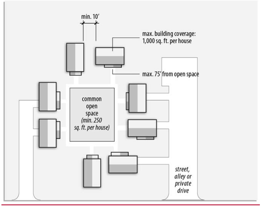 Development Size. Cottage courts must contain at least four and no more than ten houses arranged around at least two sides of a courtyard or common open space.
