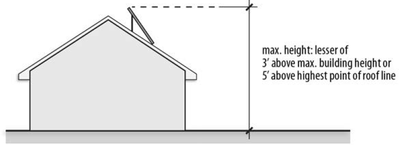 Solar energy systems may not extend more than three feet above the applicable maximum building height limit for the subject building type or more than five feet above the highest point of the roof line, whichever is less.