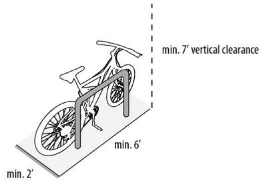 Have minimum dimensions of two feet in width by six feet in length, with a minimum overhead vertical clearance of seven feet. Bicycle lockers are exempt from overhead clearance requirements.