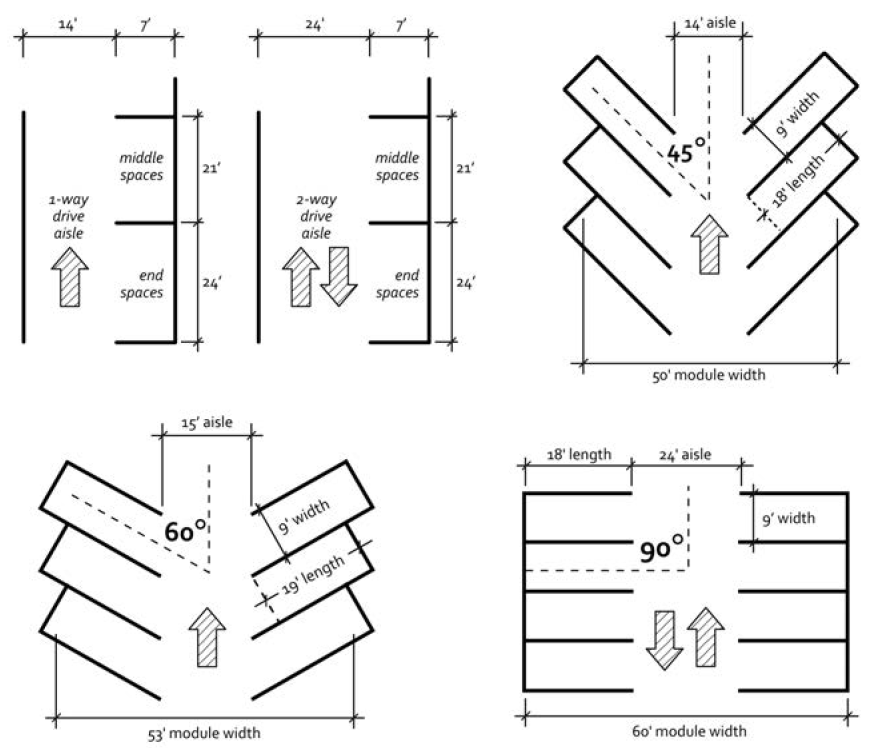 Parking Area Layout (Geometrics). Parking areas must be designed in accordance with the minimum dimensional standards of Table 40-4. Requirements for layouts or angles not shown in Table 40-4 may be interpolated from the layouts shown, as approved by the director of building safety.