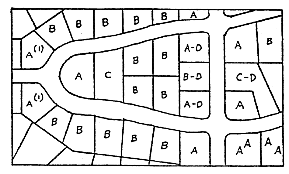 D = ;hg;Reversed frontage lot, defined as a lot on which the frontage is at right angles or approximately aright angles (interior angle less than 135 degrees) to the general pattern in the area. A reversed-frontage lot may also be a corner lot (A—D in the diagram), an interior lot (B—D), or a through (C—D).