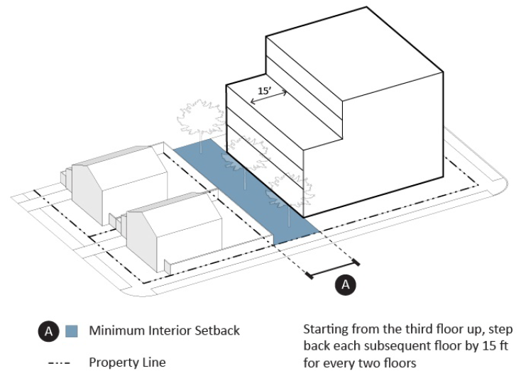 The maximum height of all buildings shall be five stories, or seventy-five (75) feet, whichever is less, except that for properties adjacent to a single-family zone, starting from the third floor up, each subsequent floor shall be stepped back by fifteen (15) feet for every two floors. See diagram below: