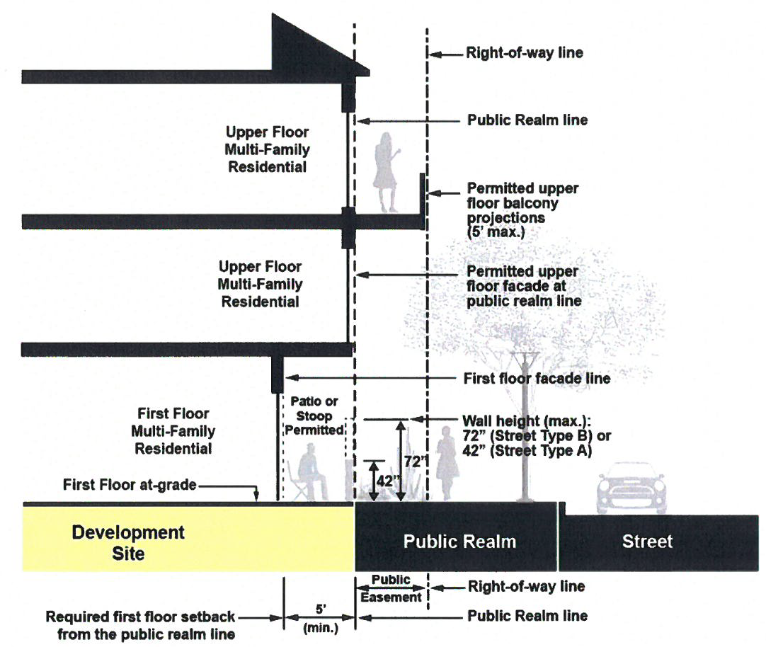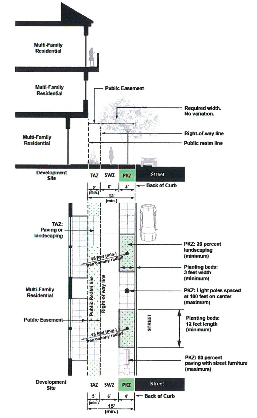 Street Type A Public Realm Zones. The intent of the multi-family public realm standards is to foster a safe, direct, and comfortable pedestrian access to first floor residential entries, internal driveways, common spaces, and paseos and encourage first floor street-oriented residential activity and visibility. Three distinct and contiguous sidewalk zones comprise the public realm.