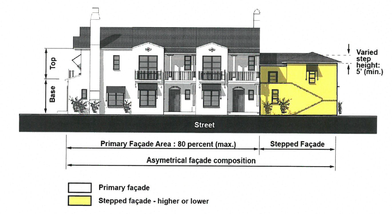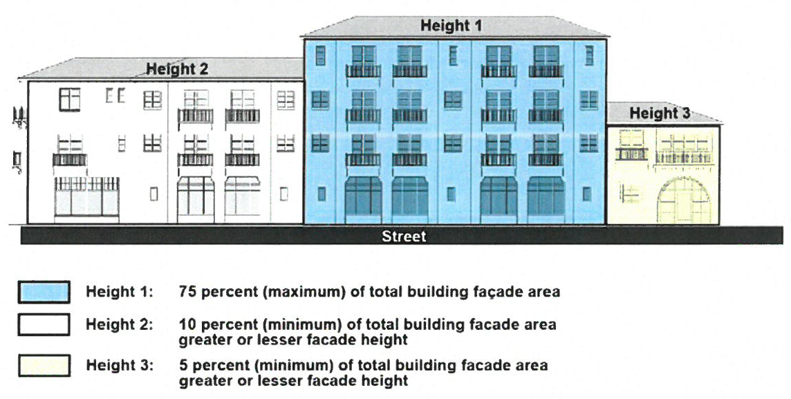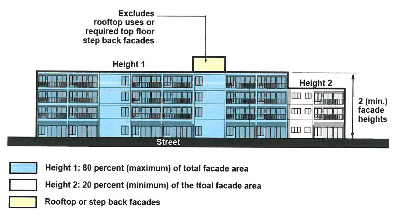 Façade height variation—Changes in façade height is not required for building two floors or less in height. Any variation in building façade height shall be asymmetrical. Where façade height variation is provided, a maximum of eighty (80) percent of the total primary façade area shall be of a uniform height. Stepped façade height shall be a minimum of five feet higher or lower than the primary façade height.