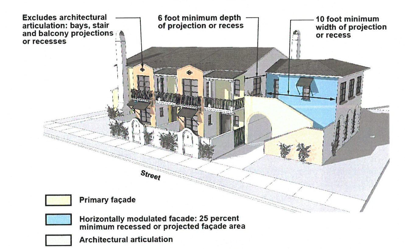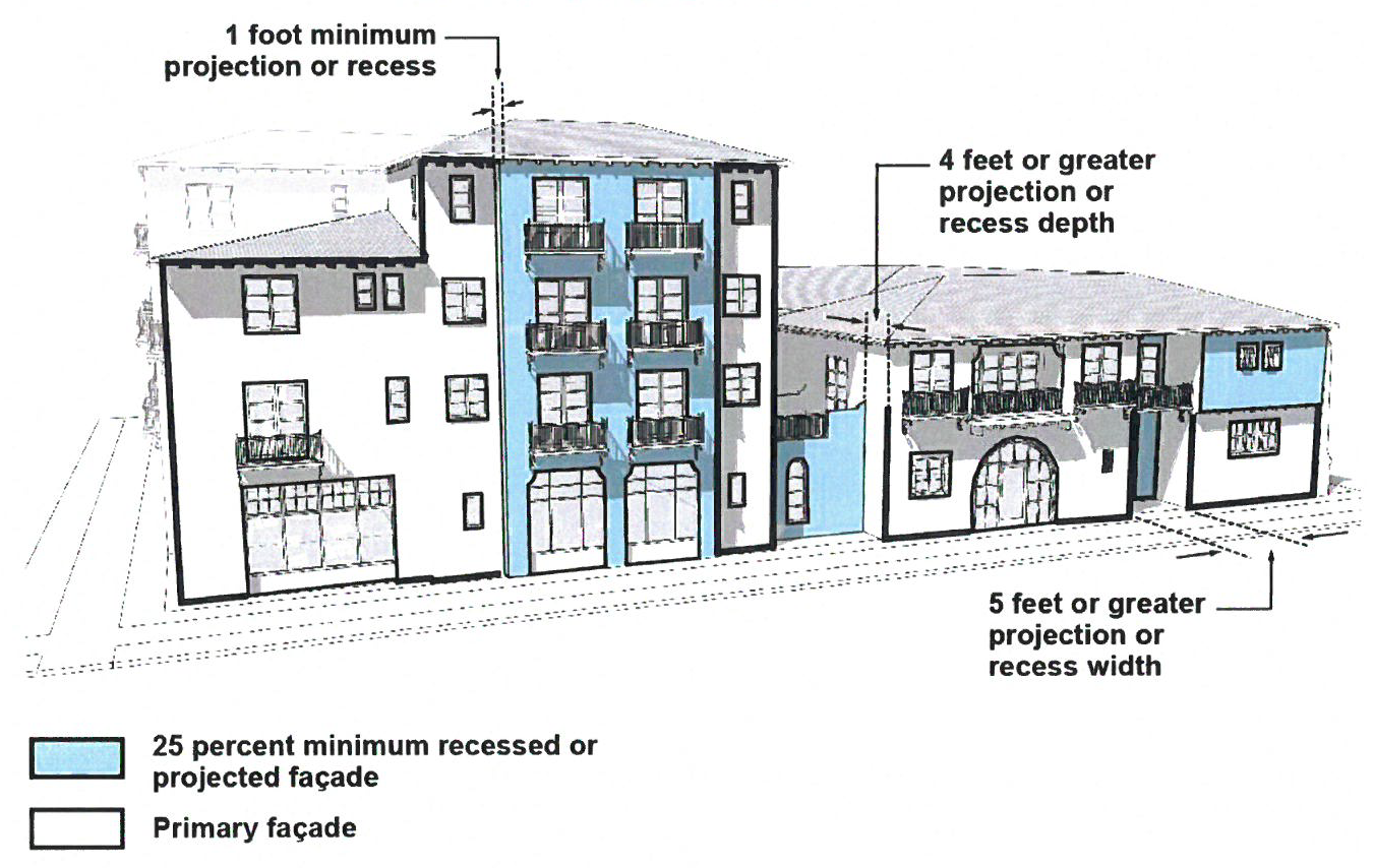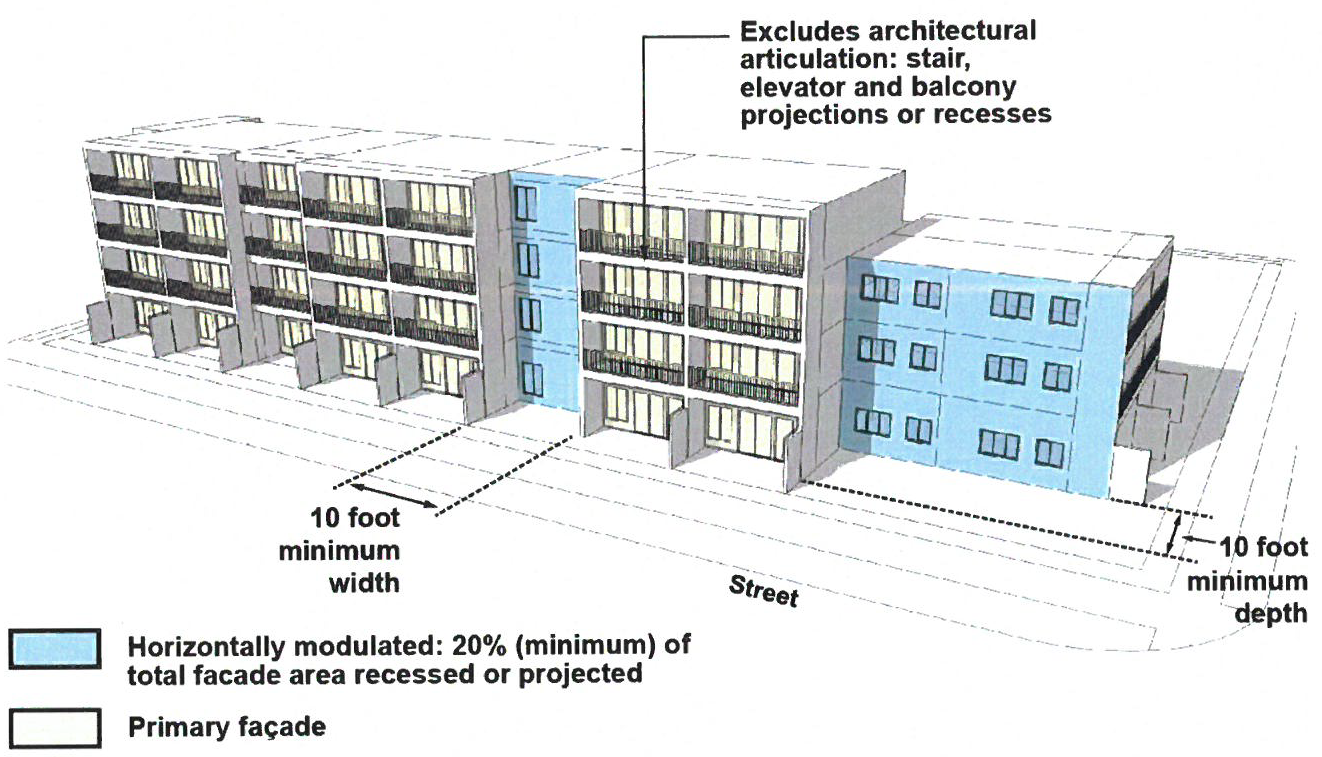 Arrangement—A minimum of twenty-five (25) percent of the total façade area shall be recessed or projected from the primary façade. Horizontal modulation variation in location, width, and depth is not required. Recessed or projecting balconies, exterior walkways, stairs, and stepback terraces shall be integrated as an essential component of all façade compositions.