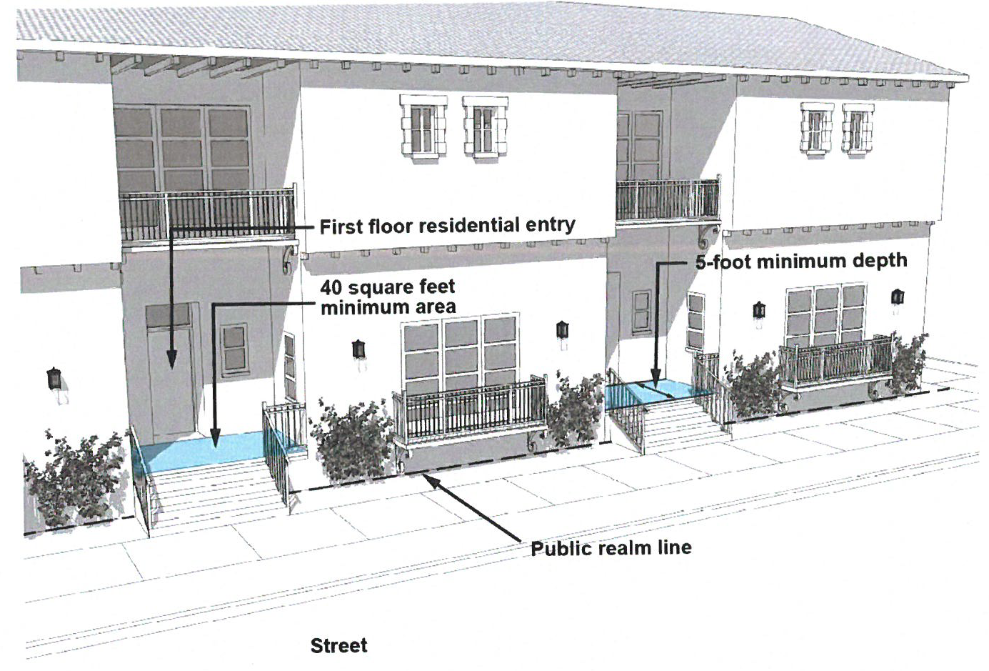 Minimum Dimensions. Entry landing or stoops not including stairs, shall be a minimum of forty (40) square feet. Individual residential entries accessed directly from the public realm and shall have a minimum walkway, ramp, and/or stairs width of six feet for single unit entries. Landings or stoops shall be a minimum of one foot wider than the entry doorway width.