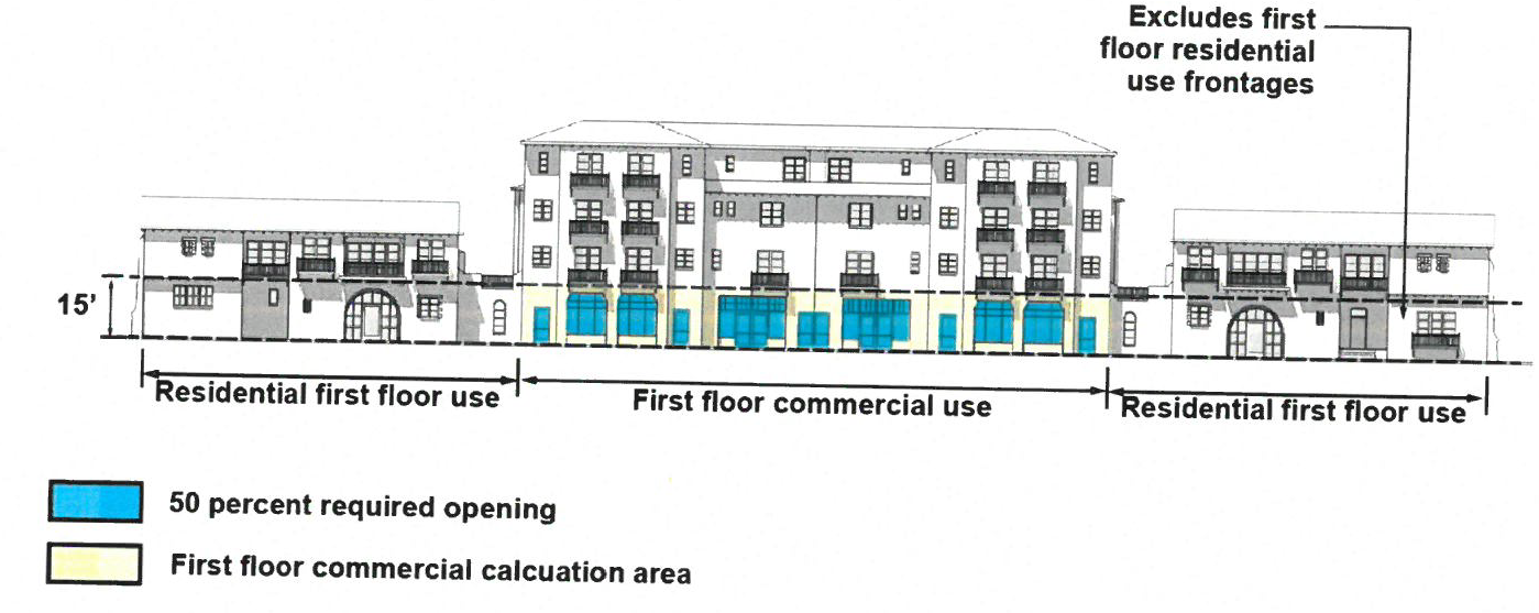 First Floor Transparency Standards. First floor commercial façades shall be designed to generate passive surveillance 'eyes on the street' visibility by engaging the public realm and providing transparency between the pedestrian realm and first floor uses. This standard applies only to portions of at-grade first floor façades that contain occupied commercial uses fronting the public realm. All multi-family mixed use development shall comply with the following standards as specified in Figure [17.20.015.15].